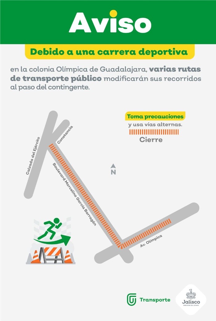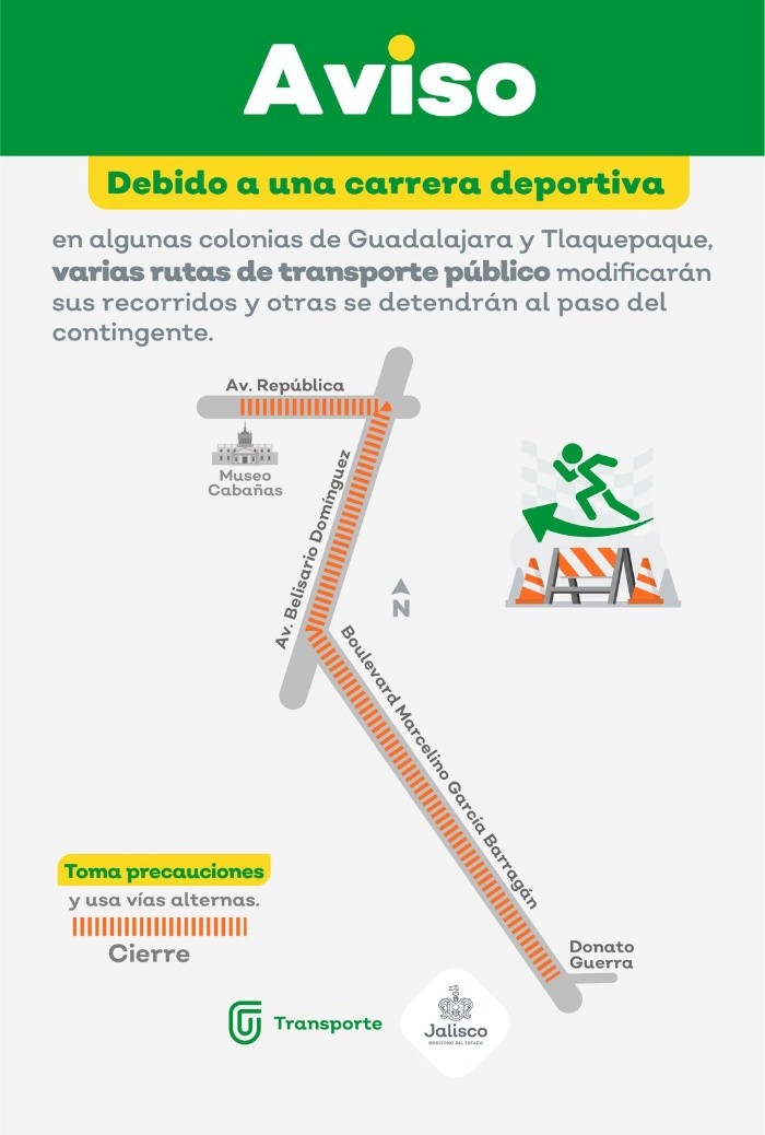 Debido a dos carreras atléticas que se llevarán a cabo este sábado en los municipios de Guadalajara y Tlaquepaque, varias rutas del transporte público detendrán su recorrido y otras lo desviarán, según informó este viernes la Secretaría de Transportes.