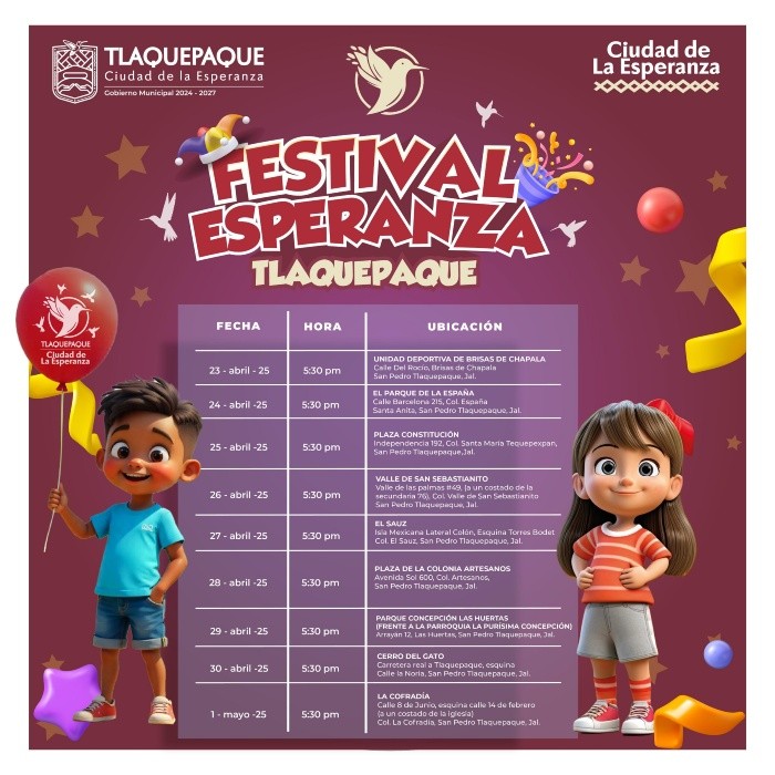 El Ayuntamiento de San Pedro Tlaquepaque celebrará el Día del Niño con el “Festival la Esperanza” del 23 de abril al jueves 1 de mayo, para que las y los pequeños del hogar puedan disfrutar de actividades divertidas y espectáculos únicos. La alcaldesa, Laura Imelda Pérez Segura destacó que el festival se llevará a cabo en distintas colonias y delegaciones del municipio con actividades como: espectáculo de payasitos, sorpresas, juguetes, bolos, comida, algodones de azúcar, juegos mecánicos, churros y más.“Es para celebrar con las niñas y los niños que son lo más importante en nuestra sociedad, vamos a llevarles un ratito de alegría, convivencia con vecinas y vecinos, es una invitación amplia, para toda la familia”. expresó la alcaldesa.Laura Imelda Pérez reconoció que en el municipio hay diversas situaciones que atender, sin embargo, recalcó la importancia de las y los niños en la sociedad como personas que necesitan su espacio, su fiesta y que los adultos recordemos lo relevantes que son. Finalmente, la presidenta de San Pedro Tlaquepaque destacó que este tipo de celebraciones fortalece la convivencia entre las personas y los lazos de solidaridad, cooperación y amor entre la comunidad.23 de abril de 2025.• Hora: 17:30 horas.• Lugar: Unidad Deportiva de Brisas de Chapala.• Calle del Rocío, colonia Brisas de Chapala.24 de abril de 2025.• Hora: 17:30 horas.• Lugar: El parque de la España.• Calle Barcelona #215, colonia España, en Santa Anita.25 de abril de 2025.• Hora: 17:30 horas.• Lugar: Plaza Constitución.• Calle Independencia #192, colonia Santa María Tequepexpan.26 de abril de 2025.• Hora: 17:30 horas.• Lugar: Valle de San Sebastianito.• Calle Valle de las Palmas #49, colonia Valle de San Sebastianito.27 de abril de 2025.• Hora: 17:30 horas.• Lugar: El Sauz.• Calle Isla Mexicana lateral Colón, esquina Torres Bodet.28 de abril de 2025.• Hora: 17:30 horas.• Lugar: Plaza de la Colonia Artesanos.• Avenida Sol #600, colonia Artesanos.29 de abril de 2025.• Hora: 17:30 horas.• Lugar: Parque Concepción de Las Huertas.• Calle Arrayan #12, colonia Las Huertas.30 de abril de 2025.• Hora: 17:30 horas.• Lugar: Cerro del Gato.• Carretera Real a Tlaquepaque, esquina calle La Noria.1 de mayo de 2025.• Hora: 17:30 horas.• Lugar: La Cofradía.• Calle 8 de Junio, esquina calle 14 de Febrero, colonia La Cofradía.NA