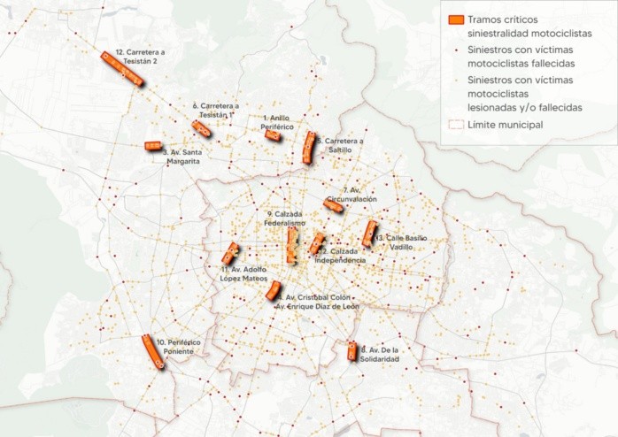 Periférico Norte, la Calzada Independencia y la Avenida Santa Margarita, son parte de las vialidades que concentran el mayor número de siniestros de motociclistas con muertos y lesionados en la Zona Metropolitana de Guadalajara (ZMG).Un análisis de siniestralidad vial de motociclistas en la ZMG, realizado por WRI México, con datos de la Secretaría de Transporte, que corresponden del 2017 al 2022, señala que 13 tramos viales ubicados en Guadalajara, Zapopan y Tlaquepaque son los más críticos.El tramo con mayor incidencia es uno de 0.8 kilómetros en el Periférico Norte, a la altura de Federalismo, en Zapopan, el cual presenta un promedio de 45 siniestros por kilómetro.Los datos fueron presentados por la Dirección de Movilidad del gobierno tapatío, durante el anuncio de su campaña de prevención llamada “No te arriesgues, baja la velocidad”, el cual surgen en colaboración con Bloomberg Philantropies y Vital Strategies.En estos puntos es donde más se reforzarán los operativos de vigilancia por parte de la Policía Vial y la Dirección de Movilidad para sancionar a los motociclistas que excedan el límite de velocidad, rebasen entre vehículos y no usen casco.Tipo de siniestros que más fallecidos ocasionan:* * * Mantente al día con las noticias, únete a nuestro canal de Whatsapp * * *OB