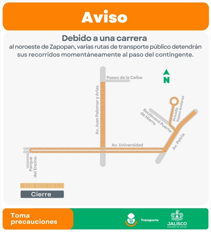 La Secretaría de Transporte Jalisco informó que el próximo domingo 16 de febrero, algunas rutas de camiones detendrán sus recorridos a partir de las 6:30 de la mañana en Zapopan, con motivo de dos carreras deportivas.