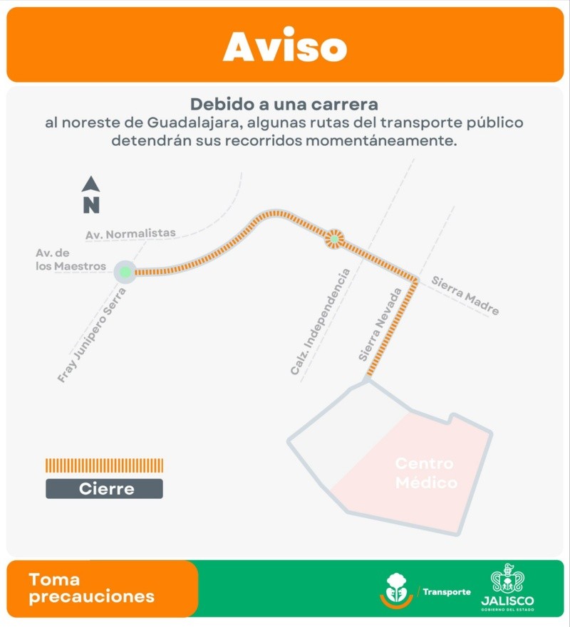 La Secretaría de Transporte Jalisco informó que el próximo domingo 28 de septiembre varias rutas de camiones detendrán y otras modificarán sus recorridos a partir de las 6:30 de la mañana en la Zona Metropolitana de Guadalajara (ZMG) debido a dos carreras deportivas.