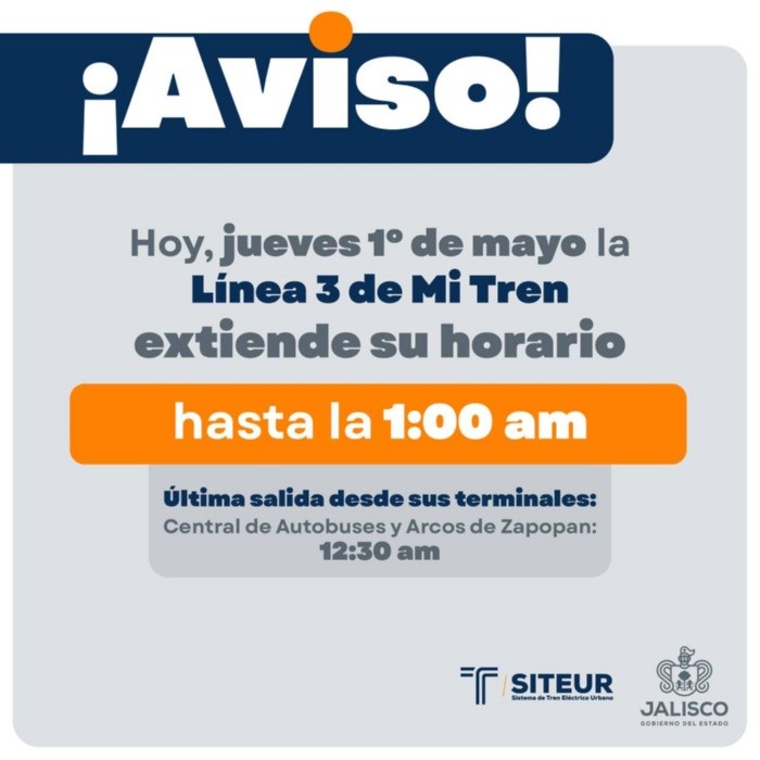 Con motivo de un importante evento musical que se celebrará en el Estadio Panamericano de Rugby en Tlaquepaque, el Sistema de Tren Eléctrico Urbano (SITEUR) anunció una ampliación especial en el horario de servicio de la Línea 3 de Mi Tren. De acuerdo con lo informado en sus redes sociales, este jueves 1 de mayo la Línea 3 del Tren Ligero extenderá su servicio hasta las 1:00 am, facilitando así el regreso seguro y cómodo de los asistentes al espectáculo.La última salida desde sus terminales será:Es importante destacar que esta medida aplica únicamente para la Línea 3; las Líneas 1 y 2 mantendrán su horario habitual, por lo que te recomendamos tomar tus precauciones.NA