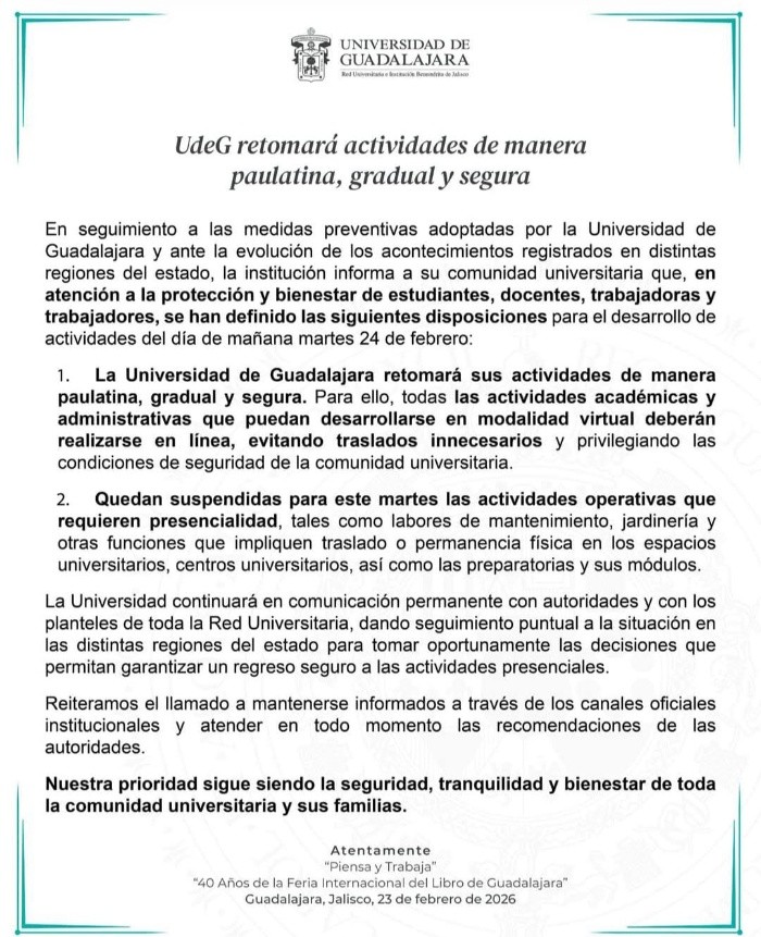 Debido a los hechos de violencia que se han registrado en Jalisco y el Área Metropolitana de Guadalajara, la Universidad de Guadalajara anunció que retomará actividades presenciales de forma gradual, paulatina y segura, por lo que todas las actividades que puedan llevarse a cabo de forma virtual deberán realizarse de esta forma a partir de mañana 24 de febrero.