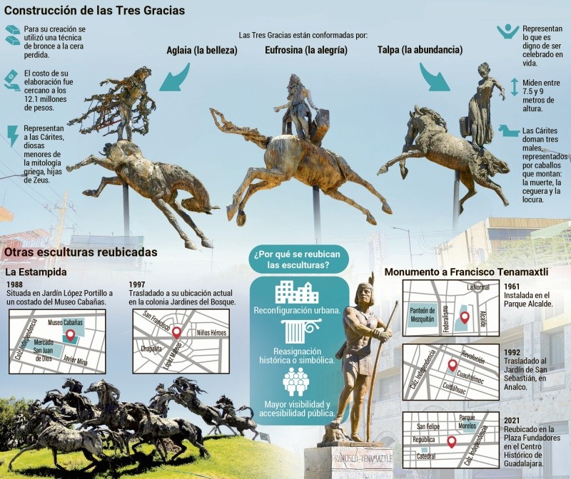 La nueva ubicación de la escultura Las Tres Gracias, del artista Sergio Garval, en la Plaza de la República, ha generado opiniones entre integrantes de la comunidad artística, quienes coinciden en que el cambio ofrece mejores condiciones de apreciación, aunque también abre cuestionamientos sobre el proceso de decisión y la pertinencia del espacio.A diferencia de su anterior emplazamiento en el camellón de Fuelle y Lázaro Cárdenas, donde el flujo vehicular dificultaba la contemplación de la obra, el nuevo sitio permite a los visitantes caminar entre las piezas y observarlas con mayor detenimiento. Además, se trata de un punto con alta afluencia peatonal y vehicular, dentro de una zona recientemente rehabilitada.Sofía Crimen, escultora tapatía, consideró que la Plaza de la República es un “buen lugar para una escultura pública de gran tamaño”, al destacar que las dimensiones de la obra -de entre 7.5 y 9 metros de altura- requieren un espacio amplio que permita múltiples puntos de vista. “Es un cruce amplio en el que nos permite tener tres puntos de vista a distancia. Si vas en auto, al parar en el semáforo, también puedes apreciarla. Pero, ¿esto es lo que el artista busca?”, cuestionó.En el mismo sentido, el escultor Jorge de la Peña subrayó que se trata de una pieza que exige tiempo y distancia para ser comprendida. Señaló que aspectos como la iluminación natural, la altura y los ángulos de observación son determinantes para su correcta apreciación. “El objetivo es que la pieza le haga un honor a la ciudad y la ciudad le haga un honor a la pieza”, expresó. Por su parte, la escultora Claudia Rodríguez reconoció que el nuevo emplazamiento favorece la visibilidad de la obra, pero advirtió posibles conflictos con actividades que se desarrollan en la zona, como el tianguis de antigüedades que se instala los domingos. También destacó la necesidad de que la comunidad se apropie de la escultura para garantizar su cuidado y permanencia.Los tres especialistas coincidieron en que el espacio ideal para una obra pública debe definirse en diálogo con su autor. Sin embargo, hasta el cierre de esta edición no se había obtenido respuesta del escultor Sergio Garval sobre si fue consultado o cuál es su postura ante la reubicación.El cambio fue avalado por el cabildo de Guadalajara. El regidor Salvador Alcázar Mendívil aseguró que la decisión incluyó la opinión de expertos y busca fomentar una nueva tradición de identidad y apropiación en la ciudad. La reubicación de esculturas en Guadalajara no es un hecho aislado. En 1997, la obra La Estampida, del escultor Jorge de la Peña, fue trasladada al cruce de López Mateos y Niños Héroes, hoy conocido como la Glorieta de los Caballos.De acuerdo con el propio artista, el cambio se realizó en coordinación con el entonces alcalde César Coll Carabias, quien consultó directamente con él antes de tomar la decisión. Ambas partes acordaron el nuevo emplazamiento, considerando factores como visibilidad, escala urbana y relación con el entorno.Para De la Peña, este antecedente ilustra la relevancia de involucrar a los creadores en la definición del destino de sus obras. Señaló que los artistas cuentan con una sensibilidad particular para evaluar si una pieza se integra adecuadamente al espacio público.Este caso contrasta con el actual debate en torno a Las Tres Gracias, donde persiste la incógnita sobre la participación de su autor en el proceso. CT
