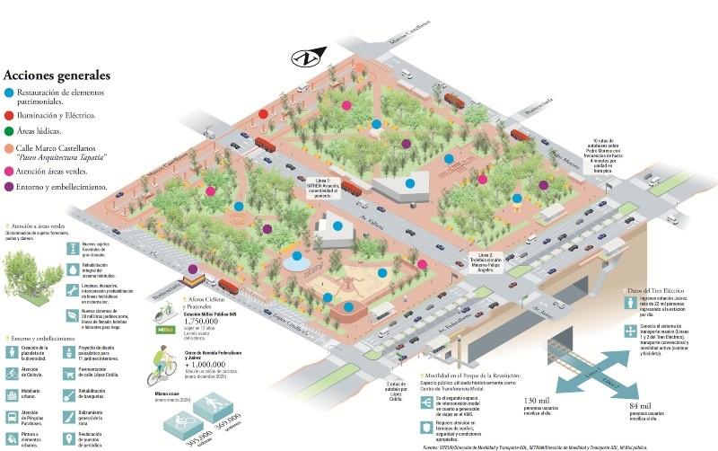 “El nodo vial y punto de trasbordo más importante del Área Metropolitana de Guadalajara”, es como describe el director de Movilidad del Gobierno de Guadalajara, Saúl González, al Parque Revolución -conocido popularmente como “Parque Rojo” por el color de sus bancas y pisos-. A lo largo de sus 91 años de historia, este espacio ha sido testigo de los cambios en la imagen urbana, las adecuaciones en vialidades ante el crecimiento de la ciudad y la consolidación del sistema del Tren Ligero. Pero no solo eso: también es el punto de encuentro de la metrópoli, donde se llevan a cabo manifestaciones, eventos culturales, deportivos, etc. En este 2026, el Parque celebra 91 años de historia con una restauración integral efectuada por el Gobierno de Guadalajara.Desde su origen, el recinto fue concebido como un punto de encuentro, aunque su diseño original cambió con el paso del tiempo. La ampliación de avenida Vallarta a mediados del siglo XX lo dividió en dos secciones, pero mantuvo su importancia para la ciudad. A finales del siglo XX, la llegada de las Líneas 1 y 2 del Tren Ligero convirtió este espacio en el principal nodo de movilidad de la ciudad, al conectar distintas zonas del área metropolitana.Pero, más allá de su función urbana, el Parque se ha consolidado como un espacio clave en la vida social y cultural de la Perla Tapatía. Es sede frecuente de actividades artísticas y movimientos juveniles, pero también ha sido escenario de manifestaciones sociales y políticas, lo que lo posiciona como un punto simbólico de expresión ciudadana.A 91 años de su inauguración, el Parque Revolución no solo refleja la evolución urbana de Guadalajara, sino que se mantiene como un espacio vivo, dinámico y representativo de la identidad tapatía.1845: Se construye la Penitenciaría de Escobedo en el sitio donde hoy se ubica el parque, tras la desamortización de bienes eclesiásticos en Guadalajara.1911-1933: La Penitenciaría es demolida gradualmente como parte de la transformación urbana de la zona y la consolidación de la colonia Americana.1927: El arquitecto Luis Barragán concibe el parque como parte de un modelo urbano moderno; el proyecto se lleva a cabo junto con Juan José Barragán.1935: El 28 de febrero se inaugura el Parque Revolución. El diseño original incluía una gran fuente central y una glorieta alineada con la avenida Vallarta, además de áreas infantiles y un trazo unitario, sin división vial.1940-1950: En esta década se consolida la apertura y ampliación de la avenida Vallarta, lo que provoca la división física del parque en dos secciones y la desaparición de la fuente central ubicada en ese eje.1950: Durante esta década, se eliminan elementos originales del diseño, entre ellos la glorieta sobre Vallarta y la zona de juegos infantiles, modificando el concepto funcionalista original.1959: Se colocan las estatuas de Francisco I. Madero y Venustiano Carranza, ubicadas en cada lado del parque ya dividido por Vallarta, reforzando su carácter simbólico.Década de 1970 (1974-1978, aproximadamente): La construcción de la calzada Federalismo reduce la superficie del parque en su lado oriente y modifica su trazo urbano original.1989: El 1 de septiembre entra en operación la Línea 1 del Tren Ligero, con estación en la zona del parque, consolidándolo como nodo de transporte masivo.1992-1994: Se construye la Línea 2 del Tren Ligero y entre 1992 y 1993 se edifica la estación subterránea Juárez II, que conecta ambas líneas y transforma profundamente el parque. La obra estuvo a cargo del arquitecto Fernando González Gortázar.1994: El 1 de julio se inaugura la Línea 2, posicionando al Parque Revolución como el principal punto de transbordo del sistema ferroviario urbano de Guadalajara.2013-2016: Se ejecuta una rehabilitación integral en dos etapas, que incluye renovación de jardinería, iluminación, andadores, infraestructura hidráulica, mobiliario urbano y mejoras en accesos al Tren Ligero.2020: Las obras relacionadas con la Línea 3 del Tren Ligero en el entorno del centro de Guadalajara generan nuevas adecuaciones urbanas en la zona, reforzando su papel como nodo de movilidad metropolitana.2025-2026: El Gobierno de Guadalajara impulsa la restauración del Parque, respetando el diseño original del arquitecto Barragán.