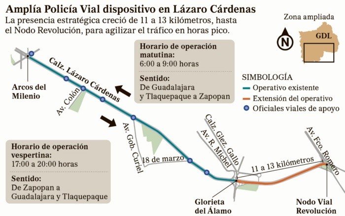 La Comisaría de la Policía Vial de la Secretaría de Seguridad del Estado anunció la ampliación de su operativo estratégico en la Calzada Lázaro Cárdenas, con el objetivo de gestionar mejor el tráfico en uno de los corredores más transitados de la Zona Metropolitana de Guadalajara (ZMG). El despliegue, que anteriormente cubría hasta la Glorieta del Álamo, se extiende ahora hasta el Nodo Vial Revolución.Jesús Israel Boruel Neri, director Vial Metropolitano, explicó que el dispositivo opera bajo una lógica de “desahogo” de carriles, ya que en determinados momentos se cierran algunas incorporaciones para distribuir mejor el flujo vehicular.“Lo que hacemos en ciertos momentos es cerrar las bayonetas de incorporación que vienen del carril lateral al central para que se utilice ese carril y quitar carga a los laterales”, señaló. Los automovilistas deberán tomar en cuenta los horarios de aplicación de lunes a viernes:Con el objetivo de evitar que un percance sature la vía, se han colocado grúas en puntos estratégicos y se mantienen patrullajes constantes con motocicletas. Esto permitirá que, en caso de choque o falla mecánica, la unidad sea removida de inmediato.Asimismo, hay presencia fija de oficiales en los cruces de Mariano Otero, Cruz del Sur, Colón, 8 de Julio, Gobernador Curiel, 18 de Marzo, Fuelle y el Nodo Revolución.Ante los cambios realizados en la dinámica de circulación, la Policía Vial recomienda a los automovilistas anticipar sus tiempos de salida, respetar los límites de velocidad y evitar distracciones como el uso del celular.* * * Mantente al día con las noticias, únete a nuestro canal de WhatsApp * * * AS