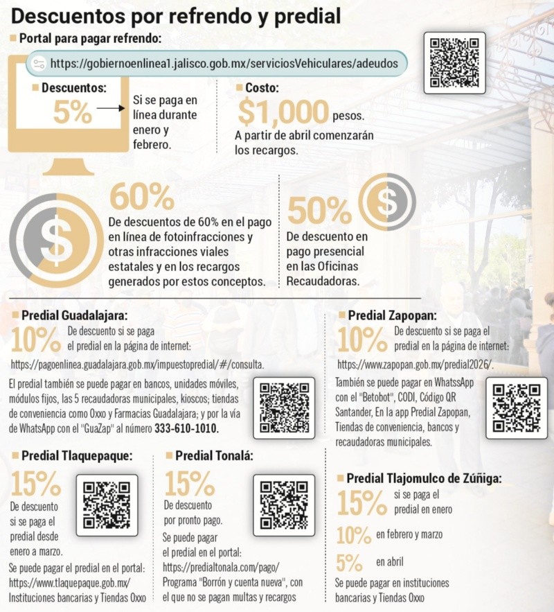 El Gobierno de Guadalajara informó que este martes 6 de enero se suspenderán todos los medios de pago de impuestos, derechos y contribuciones debido a trabajos de actualización y mantenimiento en los servidores. La medida afectará a recaudadoras, módulos fijos, zonas de autocobro, kioscos y la plataforma para pagos en línea, incluyendo la página web y la aplicación GuaZap.Las autoridades explicaron que estas labores permitirán agilizar los trámites y brindar un mejor servicio a los tapatíos que acuden a realizar sus contribuciones. El sistema había presentado problemas de lentitud que dificultaban los pagos, por lo que la Coordinación de Innovación Gubernamental consideró necesario realizar un mantenimiento mayor y una actualización integral de los servidores.En lo que va del mes, el Gobierno ha recibido el pago de más de 10 mil cuentas, un reflejo de la puntualidad de los contribuyentes en sus obligaciones fiscales. Las autoridades destacaron que estas acciones buscan modernizar los procesos administrativos, hacerlos más eficientes y garantizar que los servicios estén a la altura de las necesidades de la población.Asimismo, el Gobierno de Guadalajara agradeció a quienes han cumplido con el pago del predial y otros impuestos, reconociendo su apoyo, paciencia y comprensión durante la suspensión temporal de los servicios.Se recomienda a los contribuyentes que planeaban realizar sus pagos este martes programarlos para los próximos días, una vez concluido el mantenimiento, para evitar retrasos o inconvenientes. El Gobierno reiteró su compromiso de mantener los procesos administrativos actualizados, seguros y confiables, con el objetivo de mejorar la atención y facilitar las contribuciones de todos los ciudadanos. Pago en línea otorga descuentosPagar en línea el refrendo vehicular y el impuesto predial permite a los contribuyentes acceder a descuentos y evitar largas filas en recaudadoras municipales y estatales, como las ubicadas en el Centro Histórico de Guadalajara.El Gobierno de Jalisco ofrece un 5% de descuento en el refrendo durante enero y febrero; a partir de abril se comenzarán a aplicar recargos. Para este año, el refrendo vehicular tiene un costo de mil pesos, según la Ley de Ingresos de 2026. Además, hay descuentos del 60% en línea para fotoinfracciones y otras infracciones viales estatales, mientras que el pago presencial ofrece un beneficio menor, de 50%.Los municipios también implementan beneficios por pago digital del predial. El gobierno de Guadalajara aplica un 10% de descuento a quienes utilicen su portal https://pagoenlinea.guadalajara.gob.mx/impuestopredial/#/consulta. Este impuesto también puede pagarse en bancos, módulos fijos, kioscos, tiendas de conveniencia como Oxxo y Farmacias Guadalajara, e incluso vía WhatsApp con GuaZap al número 333-610-1010.Zapopan también ofrece 10% de descuento en línea y por WhatsApp mediante Betobot, CODI o código QR de Santander. Tlaquepaque habilitó su portal https://www.tlaquepaque.gob.mx/ para pago en línea, con descuentos aplicables por pronto pago de enero a marzo. Tonalá ofrece un 15% de descuento en línea y el programa “Borrón y cuenta nueva”, que elimina multas y recargos. En Tlajomulco, los descuentos varían: 15% en enero, 10% en febrero y marzo, y 5% en abril, con opciones de pago en bancos y tiendas Oxxo.A pesar de estas facilidades, las recaudadoras estatales y municipales registraron largas filas desde temprana hora, con esperas de más de una hora. Ciudadanos como María, Romelio Flores y Catalina Esquivel prefieren acudir presencialmente, ya sea para obtener comprobantes físicos o por costumbre.