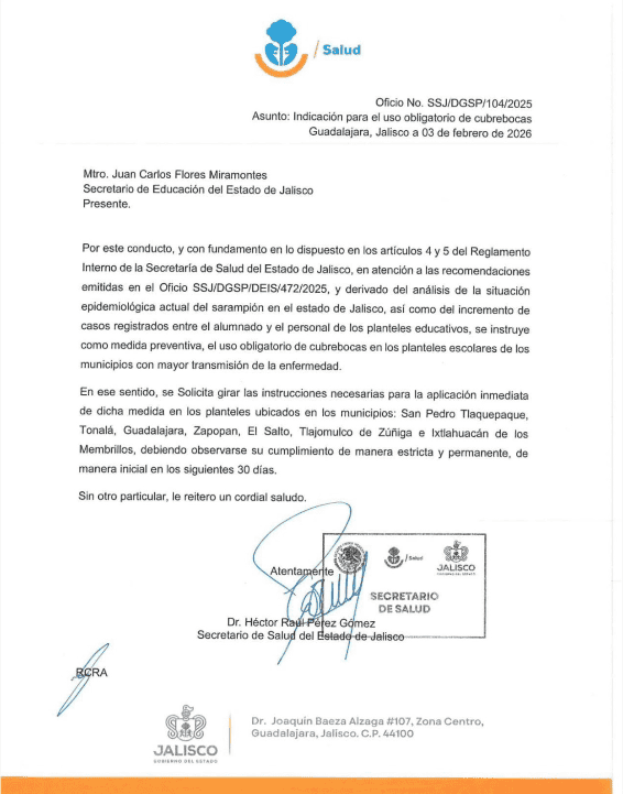 La Secretaría de Salud de Jalisco ordenó que, a partir de mañana y por un periodo mínimo de 30 días, el uso de cubrebocas será obligatorio para estudiantes, docentes y personal administrativo en todos los planteles de educación básica de municipios clave del Área Metropolitana de Guadalajara.Así lo dio a conocer como un adelanto de las medidas de reforzamiento de prevención de la enfermedad, que serán dadas a conocer este jueves por la mañana por la Secretaría de Salud, a voz de su titular, Héctor Raúl Pérez Gómez. La medida se toma como respuesta al fuerte crecimiento de casos de sarampión en la entidad, particularmente en municipios como San Pedro Tlaquepaque, Tonalá, Guadalajara, Zapopan, El Salto, Tlajomulco de Zúñiga e Ixtlahuacán de los Membrillos, donde la transmisión sigue activa y continúa al alza. "Derivado del análisis de la situación epidemiológica actual del sarampión en el estado de Jalisco, asi como del incremento de casos registrados entre el alumnado y el personal de los planteles educativos, se instruye como medida preventiva, el uso obligatorio de cubrebocas en los planteles escolares de los municipios con mayor transmision de la enfermedad", refirió un oficio circulado a las escuelas de la metrópoli firmado por el secretario. Según lo informado por la dependencia estatal, son ya 22 los planteles educativos que han registrado casos positivos de sarampión.Pérez Gómez detalló que, derivado de la enfermedad, tres planteles educativos completos —del municipio de San Pedro Tlaquepaque— y 20 salones de otras escuelas —dispersas en Guadalajara, Zapopan, Tonalá, Tala, Atotonilco y Tomatlán— ya se encuentran en clases virtuales. A este jueves, suman 8 mil 332 casos acumulados de sarampión. Tan solo en lo que va de este 2026 Jalisco suma 1 mil 875 contagios confirmados, siendo la Entidad que lidera con más casos en lo que va del año.Ayer miércoles la Organización Panamericana de la Salud (OPS) informó de una nueva alerta epidemiológica sobre sarampión en las Américas ante el incremento de casos en la región, encabezads por México, e instó a los gobiernos a intensificar la vacunación al señalar que el 78% de los nuevos casos se dio en personas no vacunadas.MF