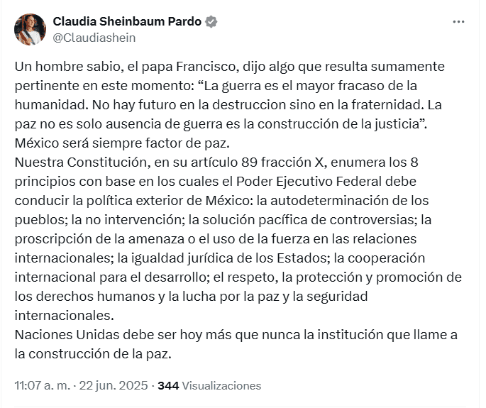 Luego de que el conflicto entre Israel e Irán escalara tras la intervención de Estados Unidos, la Presidenta de México, Claudia Sheinbaum Pardo, emitió a través de sus redes sociales un mensaje en donde, al citar al Papa Francisco, segura que "México será siempre factor de paz".“Un hombre sabio, el Papa Francisco, dijo algo que resulta sumamente pertinente en este momento: ‘La guerra es el mayor fracaso de la humanidad. No hay futuro en la destrucción, sino en la fraternidad. La paz no es solo ausencia de guerra, es la construcción de la justicia’. México será siempre factor de paz".En su publicación, la Mandataria mexicana recordó los principios fundamentales de la política exterior de nuestro país:“Nuestra Constitución, en su artículo 89 fracción X, enumera los 8 principios con base en los cuales el Poder Ejecutivo Federal debe conducir la política exterior de México: la autodeterminación de los pueblos; la no intervención; la solución pacífica de controversias; la proscripción de la amenaza o el uso de la fuerza en las relaciones internacionales; la igualdad jurídica de los Estados; la cooperación internacional para el desarrollo; el respeto, la protección y promoción de los derechos humanos y la lucha por la paz y la seguridad internacionales”.Además, exhortó a la Organización de las Naciones Unidas (ONU) a garantizar la paz. "Naciones Unidas debe ser hoy más que nunca la institución que llame a la construcción de la paz", escribió.* * * Mantente al día con las noticias, únete a nuestro canal de WhatsApp * * *MB