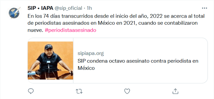 La Sociedad Interamericana de Prensa (SIP) condenó este miércoles el nuevo asesinato de un periodista en México, en este caso el de Armando Linares, el octavo homicidio contra un comunicador que ocurre en lo que va de año, según las cifras que maneja este organismo, que pidió a las autoridades atajar los casos de violencia.La SIP lamentó esta nueva "tragedia" e instó al Estado de México a atender con "responsabilidad y seriedad" los reclamos para que no siga creciendo la lista de periodistas asesinados por realizar su función.Linares, director de Monitor Michoacán, fue asesinado este martes a balazos en el municipio de Zitácuaro, en su casa y frente a sus hijos.A finales de enero, Linares, quien había denunciado de manera pública que el medio fue amenazado y temía por su vida, había dado en redes la triste noticia del asesinato de Roberto Toledo, colaborador en el mismo medio.El presidente de la SIP, Jorge Canahuati, dijo que en México los periodistas viven "atrapados" y enfrentan desde hace años ataques violentos, "sin siquiera recibir la atención debida de su propio Gobierno".Carlos Jornet, presidente de la Comisión de Libertad de Prensa e Información de la SIP, añadió que "ya es hora de que el Presidente de México tome cartas en este asunto y atienda los múltiples reclamos a nivel nacional e internacional para que cree estrategias adicionales para la seguridad de periodistas".Por contra, el Presidente Andrés Manuel López Obrador (AMLO) condenó este miércoles el asesinato de Linares en Michoacán y aseguró que no habrá impunidad en el caso.La SIP cifra en ocho los periodistas mexicanos asesinados aunque, según la ONG Artículo 19, el número sería de siete, pues no contabiliza la muerte de Jorge Camero Zazueta, en Empalme, en el estado de Sonora, como sí hace la SIP.JM