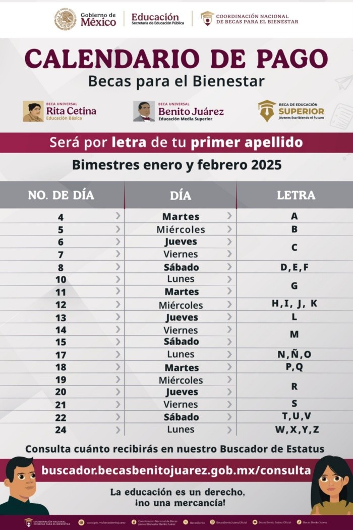La Coordinación Nacional de Becas para el Bienestar (CNBB) compartió en su cuenta de X el calendario de pagos para los beneficiarios de las Becas Benito Juárez y Jóvenes Escribiendo el Futuro, destinadas a estudiantes de nivel medio superior, cuyo pago iniciará este mes de febrero.Las y los beneficiarios recibirán su dinero correspondiente al bimestre de enero y febrero de 2025, el cual será entregado en orden alfabético, de acuerdo a la primera letra de su apellido y se llevará a cabo del 4 al 24 de febrero de 2025:Dicha beca tiene como objetivo fortalecer la educación inclusiva, equitativa y de calidad para que las nuevas generaciones tengan la oportunidad de desarrollar capacidades y su condición de vida.Si eres beneficiario de estos apoyos económicos impartidos por el Gobierno de la Ciudad de México, puedes consultar lo que te corresponde en este bimestre, así como la fecha de tu pago en el Buscador de Estatus.De acuerdo al ajuste realizado, los estudiantes de bachillerato y universidad que estén inscritos en los programas, verán reflejado un aumento en el apoyo económico que reciben cada dos meses.NA