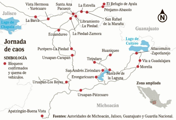 El miércoles se desató una serie de narcobloqueos y quema de vehículos en las tres entidades mencioandas, así como el incendio de tiendas de conveniencia.