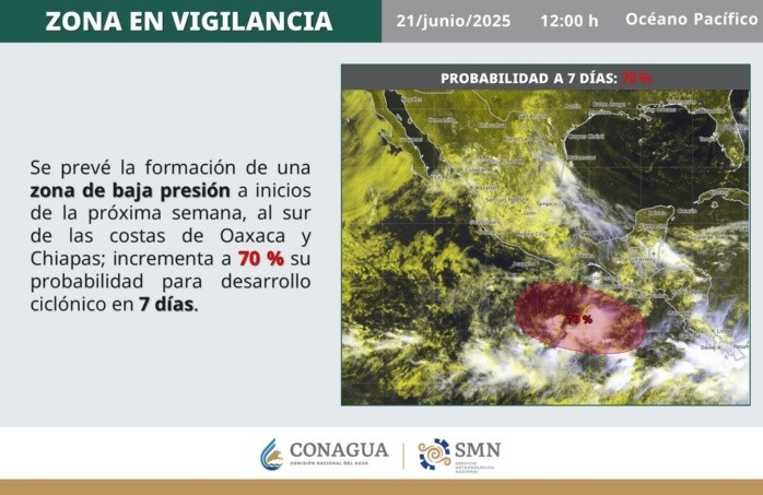 En su reporte de las 11:51 de la mañana de hoy, el Servicio Meteorológico Nacional (SMN) indicó que se prevé la formación de la nueva zona de baja presión a inicios de la siguiente semana, aunque incrementa la probabilidad de desarrollo ciclónico a 70% en 7 días.