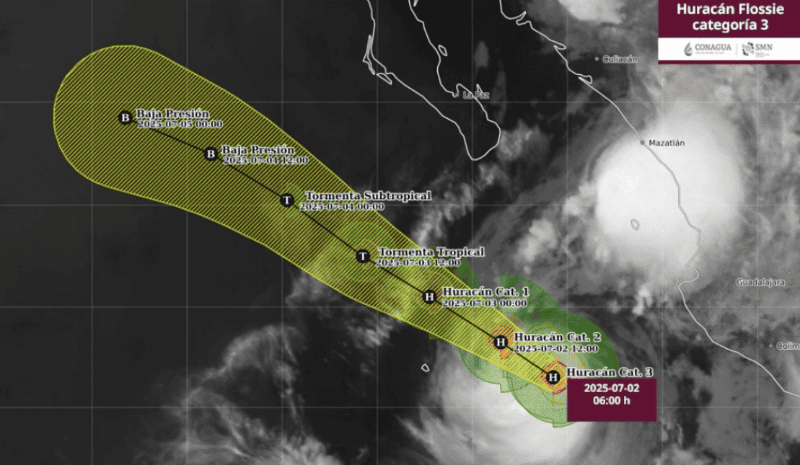 El huracán "Flossie" amanece este miércoles 02 de julio con su poderosa categoría 3 en la escala Saffir-Simpson y se localiza cerca de Jalisco, informó esta mañana el Servicio Meteorológico Nacional (SMN), fuente climática oficial del Gobierno de México.“Flossie”, como huracán de categoría 3, se localiza frente a las costas de Jalisco y Colima. Su amplia circulación genera lluvias puntuales fuertes, vientos fuertes y oleaje elevado en el noroeste y occidente del país. En las próximas horas “Flossie” empezará a debilitarse gradualmente debido a su desplazamiento sobre aguas menos cálidas, mientas continúa alejándose de las costas del occidente de México. A partir de la tarde, dejará de afectar directamente al país.Con relación a su distancia al lugar más cercano, el ciclón tropical se localiza a 360km al oeste-suroeste de Cabo Corrientes, Jalisco, y a 470 km al sur-sureste de Cabo San Lucas, Baja California Sur.Además, su desplazamiento actual es hacia el oeste-noroeste (300°) a 17 km/h. Mantiene vientos máximos sostenidos de 185 km/h y rachas de 220 km/h.Se esperan lluvias puntuales fuertes (25 a 50 mm) en Sinaloa (sierra y sur) y Nayarit, así como lluvias e intervalos de chubascos (5 a 25 mm) en Colima, Jalisco (oeste, costa y sur) y Baja California Sur (centro y sur).También se prevén vientos sostenidos de 30 a 40 km/h con rachas de 60 a 80 km/h y oleaje de 2.5 a 3.5 metros de altura en costas de Baja California Sur, Sinaloa, Nayarit, Jalisco y Colima.Se pide a la población extremar precauciones a la población en general en las zonas de los estados mencionados por lluvias, viento y oleaje (incluyendo la navegación marítima) y atender las recomendaciones emitidas por las autoridades del Sistema Nacional de Protección Civil, en cada entidad.Con información del Servicio Meteorológico Nacional* * * Mantente al día con las noticias, únete a nuestro canal de WhatsApp * * *OA