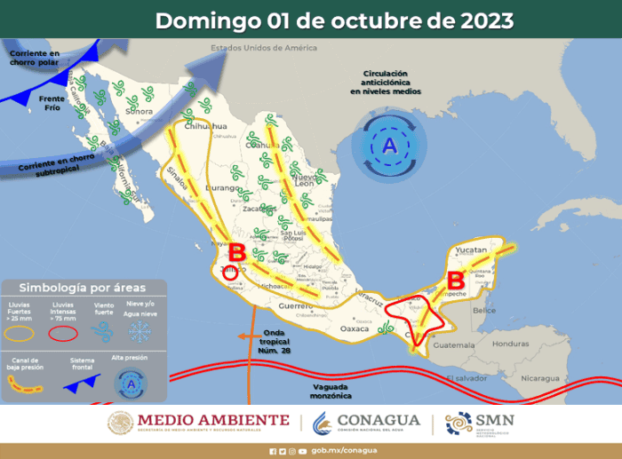 El Servicio Meteorológico Nacional (SMN), fuente climática oficial del Gobierno de México en materia climática, anunció desde ayer el ingreso de un nuevo frente frío al territorio nacional este sábado.A través de su pronóstico de ayer, el SMN señalaba que desde hoy y hasta el domingo, se anticipa un temporal de lluvias muy fuertes a intensas sobre la península de Yucatán y sureste mexicano, debido a un sistema de baja presión en interacción con la onda tropical número 28, un canal de baja presión e inestabilidad en niveles altos de la atmósfera.Durante la tarde-noche, un nuevo frente frío, asociado con la corriente en chorro polar, arribará al noroeste del país, originando lluvias aisladas en Baja California, así como vientos de 60 a 80 km/h y posibles tolvaneras en Baja California, Sonora y Chihuahua. Lluvias el sábado 30 de septiembre:Lluvias domingo 01 de octubre:Lluvias lunes 02 de octubre:Con información del Servicio Meteorológico NacionalOA