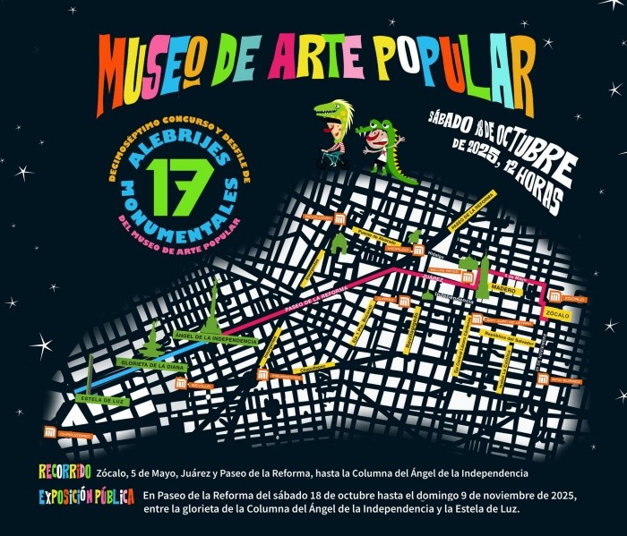Los alebrijes nacieron de las alucinaciones febriles del artesano del cartón Pedro Linares, quien en 1936 soñó con criaturas fantásticas y de colores encendidos que gritaban una y otra vez: “¡alebrijes, alebrijes!”.Una vez recuperado, dio forma a sus ensueños de una manera tan original, que esos seres de cuernos, alas, colas y colmillos multicolores se han convertido en un símbolo de la cultura popular mexicana, reconocido a nivel mundial.Este sábado, como desde 2007, las alucinaciones del artesano tomarán proporciones colosales con el Desfile de Alebrijes, organizado por el Museo de Arte Popular. Para evitar contratiempos —y no tener pesadillas con los alebrijes— conviene estar al tanto de la ruta, el horario y los cierres viales del evento.El recorrido iniciará a las 12:00 horas en el Zócalo. Continuará por las calles 5 de Mayo, Eje Central Lázaro Cárdenas, avenida Juárez y Paseo de la Reforma, hasta llegar a la columna del Ángel de la Independencia.Durante el evento también estarán cerrados los cruces con las calles Isabel la Católica, Eje Central Lázaro Cárdenas, Revillagigedo, Eje 1 Poniente Bucareli e Insurgentes. Como alternativa vial al sur del Centro para desplazarse de oriente a poniente (y viceversa), se pueden utilizar la Avenida Chapultepec y la calle Izazaga.Para trasladarse de norte a sur, se puede utilizar el Eje 1 Oriente Circunvalación; y para ir de poniente a oriente, el Eje 1 Norte López Rayón.Para traslados hacia el poniente, o de norte a sur y viceversa, se recomienda utilizar el Circuito Interior.Se espera que más de 200 criaturas formen parte del desfile y del concurso.Además, desde hoy y hasta el domingo 9 de noviembre, habrá una exposición pública en el Paseo de la Reforma, en el tramo comprendido entre el Ángel de la Independencia y la Estela de Luz.