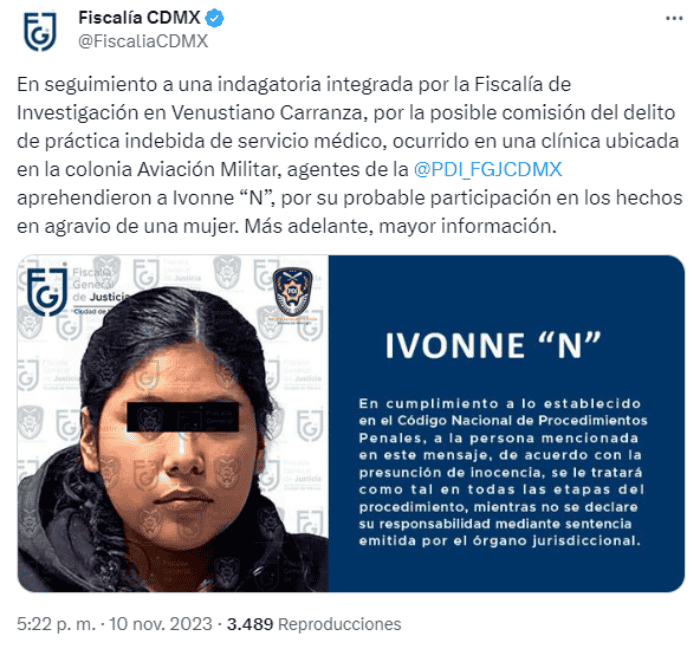 La doctora Ivonne "N" fue detenida por la Fiscalía General de Justicia por hacerle creer a Liliana Carmona que estaba embarazada de gemelos durante nueva meses para beneficiarse economicamente.Por este caso suman dos detenidos, primero el cirujano Víctor Manuel "N", quien se encuentra vinculado a proceso.Los agentes adscritos a la Coordinación de Investigación Territorial en Venustiano Carranza 5, de la Coordinación General de Investigación Territorial, ubicaron a la persona requerida en calles de la citada demarcación, por lo que le hicieron de su conocimiento que contaba con un mandato judicial en su contra.Fue trasladada al Centro de Reinserción Social Santa Martha Acatitla, para ponerla a disposición del juez que la requirió y determinar su situación jurídica.Las investigaciones refieren que la imputada, de profesión médico, posiblemente atendió a la víctima, a quien le practicaron una cesárea; no obstante, la mujer no se encontraba embarazada."En seguimiento a una indagatoria integrada por la Fiscalía de Investigación en Venustiano Carranza, por la posible comisión del delito de práctica indebida de servicio médico, ocurrido en una clínica ubicada en la colonia Aviación Militar, agentes de la @PDI_FGJCDMX aprehendieron a Ivonne "N", por su probable participación en los hechos en agravio de una mujer", señalaron en redes.SV