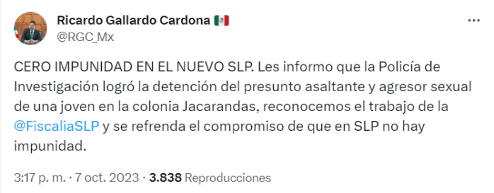 La tarde de este sábado mediante su cuenta de X el gobernador de San Luis Potosí anunció que la Policía de Investigación logró ubicar y aprehender al motociclista que el día 05 de octubre asaltó y agredió sexualmente a una mujer en la colonia Jacarandas, en la capital potosina.El mandatario sentenció que en el estado hay cero impunidades con estos agresores y reconoció el trabajo de la Fiscalía General del Estado para aprehender al presunto responsable.El ataque fue denunciado el pasado jueves por la noche, por la joven mujer que fue víctima de una pareja de hombres a bordo de una motocicleta mientras transitaba por la colonia Jacarandas, según lo relatado en sus redes, uno de los hombres acorraló a la joven (quien llevaba audífonos) e inmediatamente procedió a despojarla de sus pertenencias."Unos hombres en moto me vieron y uno de ellos se baja a quitarme mis cosas, mi celular, audífonos, dinero…"No conforme, en el video se observa cómo es que el hombre abraza a la joven apretándola contra su cuerpo, realizándole tocamientos y forzándola a besarlo:"Al descarado no le fue suficiente y me empezó a decir 'que me le antojaba', empezó a decirme 'bésame o te mato' y me hizo estarlo besando, posteriormente me dijo que quería quitarme mi licra y 'meterme una cogida' si no accedía me iba a matar".Además de lo que se ve en el video, la chica denunció que el asaltante la obligó a masturbarlo y que también la quería obligar a que le hiciera sexo oral."Después pueden ver en el video como me lleva agarrada hacia un árbol que está frente a las cámaras y me hizo masturbarlo, me pidió que le hiciera incluso sexo oral, a lo cual no accedí y volvió a amenazarme de muerte y vio pasar más gente y fue como me dejó ir."Al momento, la fiscalía no ha emitido detalles sobre la captura e identidad del hombre presunto responsable del asalto y abuso sexual. YC
