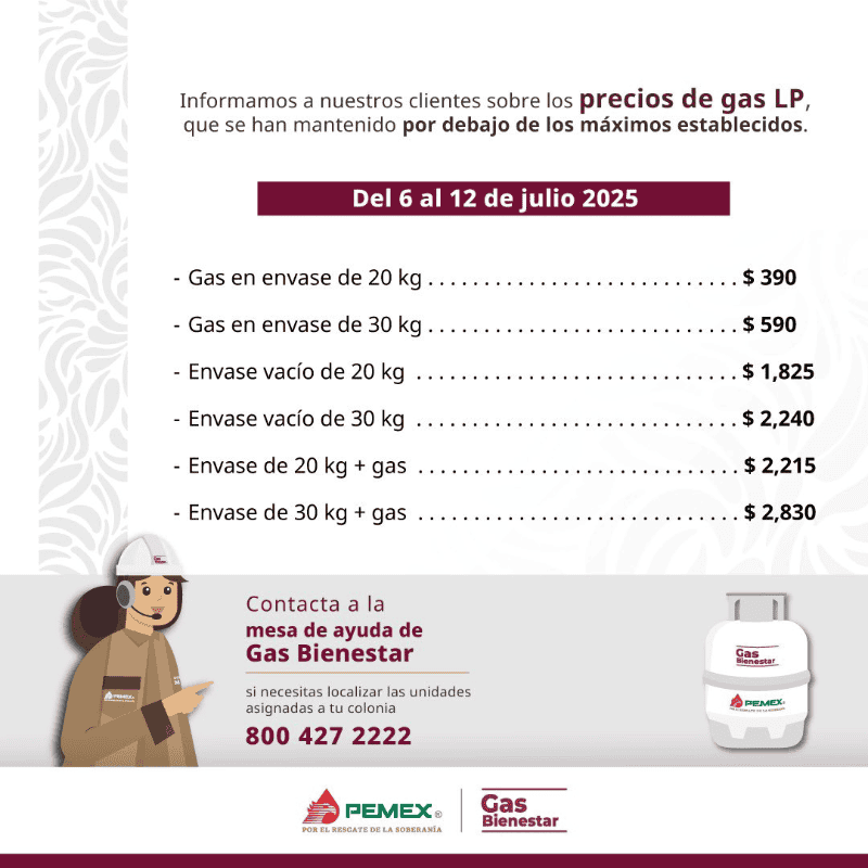 El Gobierno de México, con el objetivo de garantizar precios justos en la distribución de gas LP, ha puesto en marcha el programa Gas Bienestar, gestionado por Petróleos Mexicanos. Este programa está actualmente en funcionamiento en la Ciudad de México, donde, a través de su cuenta oficial en X (antes conocido como Twitter), Gas Bienestar ha publicado los precios que estarán vigentes del 07 al 12 de julio.Estos precios, orientados a apoyar la economía familiar y evitar aumentos no justificados, reflejan el compromiso de proporcionar un energético esencial a costos accesibles dentro de los límites establecidos por la Comisión Nacional de Energía.Estos precios se mantienen dentro de los topes máximos establecidos por las autoridades regulatorias, como parte de la estrategia de Gas Bienestar para ofrecer un servicio de calidad con cilindros supervisados y sellos de garantía que aseguren el 100% del contenido.Solicitar el suministro de Gas Bienestar es un proceso sencillo y accesible. A través de su cuenta de X, este programa informó que la única manera de solicitar la venta de cilindros es por pedido.La empresa, que opera con camiones equipados con tecnología avanzada para garantizar seguridad y localización, invita a los consumidores a contactar al centro de ayuda al número 800 427 2222 para cualquier consulta o servicio.YC