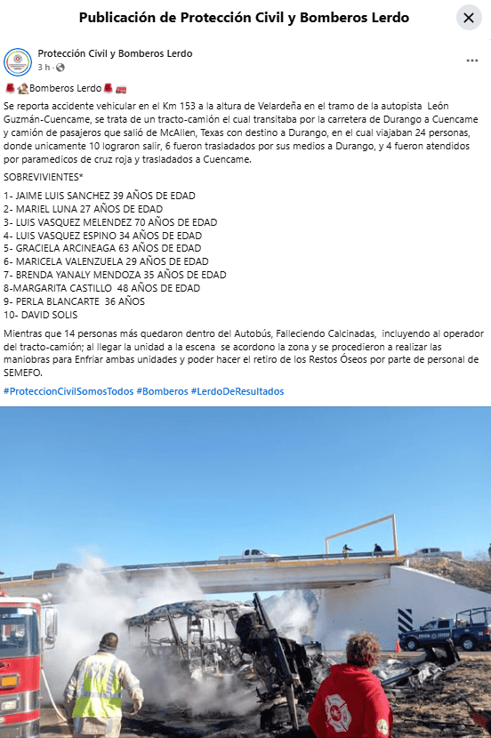 Este lunes 10 de marzo, en redes sociales circularon imágenes del choque de un camión de pasajeros y un tractocamión en el municipio de Gómez Palacio, Durango. Más tarde, se confirmó el accidente, el cual ocurrió en el kilómetro 153, a la altura de Velardeña, en el tramo de la autopista León Guzmán-Cuencamé.Protección Civil y Bomberos de Lerdo, en el estado de Durango, informó a través de su página de Facebook que un tractocamión que circulaba por la carretera Durango-Cuencamé chocó contra un camión de pasajeros. En este último, que partió de McAllen, Texas, con destino a la capital de Durango, viajaban 24 personas. De ellas, solo 10 lograron salir; seis se trasladaron por sus propios medios a Durango, mientras que las otras cuatro fueron enviadas a Cuencamé.El reporte de PC indica que 14 personas quedaron dentro del autobús y fallecieron debido al incendio del mismo.La unidad llegó a la zona para acordonarla y realizar maniobras de enfriamiento, para posteriormente retirar los cuerpos por parte de personal del Servicio Médico Forense (Semefo).*Mantente al día con las noticias, únete a nuestro canal de WhatsAppOF
