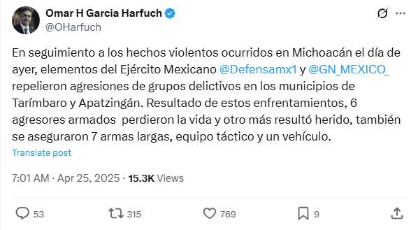 Omar García Harfuch, titular de la Secretaría de Seguridad y Protección Ciudadana, señaló que, en seguimiento a los hechos violentos ocurridos en Michoacán, elementos del Ejército y Guardia Nacional, repelieron agresiones de grupos delictivos en los municipios de Tarímbaro y Apatzingán."Resultado de estos enfrentamientos, seis agresores armados perdieron la vida y otro más resultó herido, también se aseguraron siete armas largas, equipo táctico y un vehículo", informó Harfuch desde X.El jueves pasado, García Harfuch, destacó que los hechos de violencia que se registraron el día miércoles 23 de abril en Jalisco, Michoacán y Guanajuato, son resultado de los conflictos entre dos grupos delictivos que disputan los territorios.En esa ocasión, detalló que se registraron hechos violentos en 29 municipios de los estados de Michoacán, Guanajuato y Jalisco, que derivó en:En una acción coordinada de las autoridades locales y del Gabinete de Seguridad, se recuperaron las vialidades y se estabilizó la situación en dichas entidades, donde se ha reforzado la presencia del personal y se aseguraron diversos artefactos explosivos y se destruyeron minas."Estos hechos no quedarán impunes e informaremos las detenciones correspondientes", aseveró el titular.* * * Mantente al día con las noticias, únete a nuestro canal de WhatsApp * * *FF