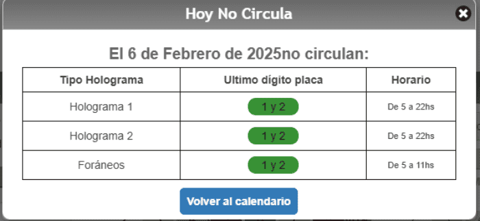 El programa Hoy No Circula limita la circulación de los autos en función del último dígito de la placa y el color del engomado, con el objetivo de prevenir, minimizar y controlar la emisión de contaminantes a la atmósfera de la Zona Metropolitana del Valle de México. En ese sentido, para mañana jueves 6 de febrero del 2025 los siguientes autos descansan en la Ciudad de México (CDMX) y el Estado de México (Edomex): Mientras que los autos con los hologramas 00 y 0 están exentos de las limitaciones establecidas en el programa, así como los vehículos eléctricos e híbridos. Para que mañana puedas tomar tus precauciones, te recordamos que el horario del Hoy No Circula es desde las 5:00 de la mañana a las 10:00 de la noche, sin embargo, para los automóviles con placas foráneas, la restricción será de 5:00 a 11:00 horas.El Hoy No Circula aplica en las 16 alcaldías de la CDMX y en 18 municipios de Edomex:NA