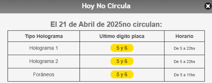 El programa Hoy No Circula del lunes 21 de abril aplica para vehículos con engomado AMARILLO, terminación de placa 5 y 6, y hologramas 1 y 2, durante el horario de 5:00 a 22:00 horas. Este programa, que busca reducir la contaminación y proteger el medio ambiente, restringe la circulación de automóviles en la Ciudad de México y en el Estado de México todos los días de la semana.El programa está en vigor en los siguientes municipios: El Hoy No Circula no aplica a todos los vehículos. Las excepciones son los autos que: SV