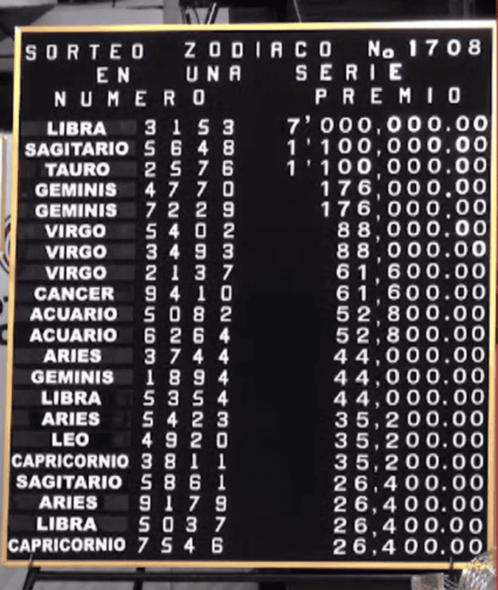 Cada domingo es una nueva oportunidad para tentar a la suerte con el Sorteo Zodiaco de la Lotería Nacional, uno de los sorteos más esperados por los amantes del azar. En esta ocasión, la edición número 1708 se celebra este domingo 22 de junio de 2025, ofreciendo a los participantes la posibilidad de ganar un atractivo premio mayor.El Sorteo Zodiaco ha ganado popularidad entre los jugadores frecuentes gracias a sus importantes premios y su carácter conmemorativo.El premio mayor que estará en juego este domingo asciende a 7 millones de pesos, lo que representa una excelente oportunidad para quienes compren su cachito. Si la suerte te acompaña, podrías convertirte en uno de los grandes ganadores de este emblemático sorteo que semana tras semana mantiene viva la tradición y la esperanza de miles de personas.Participar es muy sencillo: puedes adquirir tu boleto en los puntos de venta autorizados o a través de la página oficial de la Lotería Nacional. Con tan solo 20 pesos por cachito, podrías ser el próximo afortunado en cambiar tu vida.Los resultados del Sorteo Zodiaco se darán a conocer este domingo en punto de las 20:00 horas. Si participaste, no olvides consultar los números ganadores a través de EL INFORMADOR.Se han dado a conocer los números ganadores del sorteo. El premio mayor de 7 millones de pesos corresponde al signo libra con el número 3153.SV