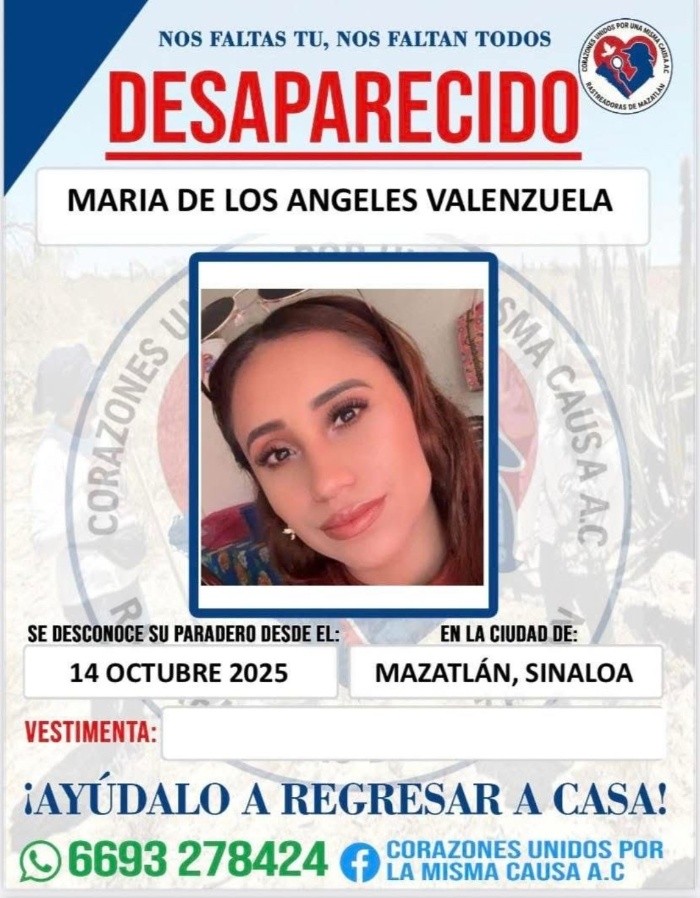 En el municipio de Mazatlán se reportó la desaparición de dos mujeres, en sitios y circunstancias distintas. Una de las víctimas es la activista de búsqueda de personas, María de los Ángeles Valenzuela, la cual presuntamente fue privada de su libertad por personas armadas en la colonia Salvador Allende.