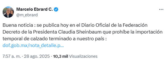 Fue al inicio de la conferencia de prensa matutina que Ebrard habló sobre el anuncio. Explicó que la prohibición fue a partir de una instrucción de la Presidenta de México, Claudia Sheinbaum, ya que a México estaba llegando calzado terminado, sin embargo, el mecanismo de llegada estaba enfocado en la evasión de impuestos y afectando a los productores nacionales de esta industria.
