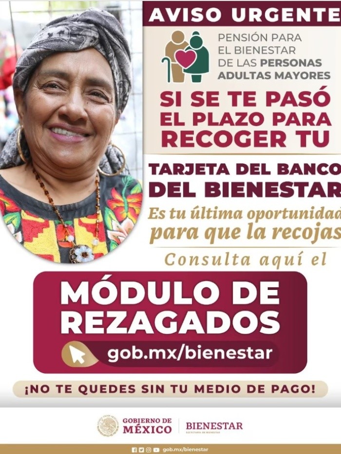 La Pensión del Bienestar es un programa federal por parte del Gobierno cuyo propósito es ayudar económicamente a los adultos mayores de México sin importar su condición o clase social. No obstante, la Secretaría del Bienestar lanzó un importante y urgente anuncio, dirigido a los beneficiarios rezagados -es decir, que no han recogido su tarjeta del bienestar-, que no puede pasar desapercibido. Adriana Montiel, titular de la Secretaría del Bienestar, lanzó un comunicado a través de sus redes sociales en el que indica que se ha abierto la última convocatoria para que los adultos mayores puedan tramitar su tarjeta, debido a que por disposición oficial, la pensión ya no se cobra en efectivo. De modo que, sin tarjeta, ya no será posible recibir dinero. ¡No te quedes sin tu pago!, escribió la secretaria. “Aviso urgente. Si se te pasó el plazo para recoger tu tarjeta del Banco del Bienestar, es tu última oportunidad para que la recojas ¡No te quedes sin tu medio de pago!”, indica el comunicado oficial del Gobierno. Para acudir por ella, primero deben ubicar el módulo de rezagados en las páginas oficiales del programa.Para recibir tu nueva tarjeta en el módulo correcto, es necesario presentar la siguiente documentación: Asimismo, las personas adultas mayores que no puedan acudir a su módulo, deberán agendar una visita domiciliaria al número 800 639 42 64 y posteriormente personal del programa acudirá a su domicilio para brindar su tarjeta de la Pensión Bienestar 2023.FS