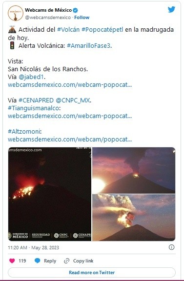 Pese a que en las últimas 24 horas no se registraron explosiones del volcán Popocatépetl, la Coordinación Nacional de Protección Civil (CNPC) informó que se mantiene el semáforo en amarillo fase 3 de la alerta volcánica.En su reporte de las 05:00 horas, Protección Civil detalló que el corte del indica que la señal de tremor continúa disminuyendo en general su amplitud, presentando sólo algunos episodios mayores con duraciones variables que oscilan de una a dos horas. También se reportó un ligero aumento en la energía acumulada por la amplitud de la señal sísmica del tremor. Continúa la emisión de vapor de agua, otros gases volcánicos y ceniza con dirección al sur-suroeste (SSO) y se observa en ocasiones la expulsión de fragmentos incandescentes a corta distancia del cráter.En dicho horario no se reportó caída de ceniza en Morelos, Puebla y Tlaxcala; sin embargo, cibernautas aseguraron que seguía cayendo en varias zonas de los Estados.Por su parte, Webcams de México compartió imágenes en las que se observó la evolución de la actividad del Popocatépetl desde las primeras horas de este domingo en las que se observa al cráter desprender grandes cantidades de humo. JM