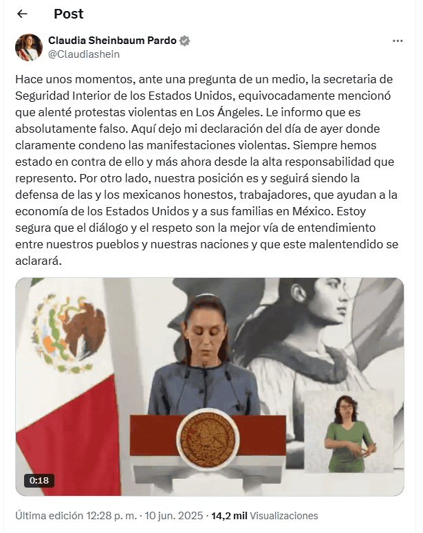 “Hace unos momentos, ante una pregunta de un medio, la secretaria de Seguridad Interior de los Estados Unidos, equivocadamente mencionó que alenté protestas violentas en Los Ángeles. Le informo que es absolutamente falso. Aquí dejo mi declaración del día de ayer donde claramente condeno las manifestaciones violentas”.
