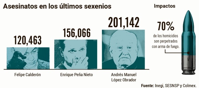 Desde 2005, en los inicios del sexenio de Felipe Calderón y de la llamada guerra contra el narcotráfico, ingresan cada año a México entre 200 mil y hasta 873 mil armas de fuego ilegales procedentes de Estados Unidos, según el estudio Aporte del Seminario sobre Violencia y Paz de El Colegio de México a la discusión sobre las armas de fuego en México.Hasta 2024, en el país se habían detectado aproximadamente tres millones 900 mil armas ilegales, de las cuales las autoridades federales sólo lograron incautar el 8.64% de éstas, es decir, alrededor de 337 mil. El resto permanece en circulación, en manos de civiles o de grupos del crimen organizado.El informe de El Colegio de México también advierte que, desde 2004 -cuando en Estados Unidos se revocó la Prohibición Federal de Armas de Asalto y se promulgó la Ley de Protección de Comercio Legal de Armas-, el porcentaje de homicidios cometidos con armas de fuego en México se incrementó de manera significativa: pasó de cinco de cada 10 a siete de cada 10 muertes por disparo hasta el año pasado.La disparidad entre las estimaciones oficiales se debe a la variedad de fuentes que analizan el tráfico de armas entre ambos países. Por ejemplo, la administración de Andrés Manuel López Obrador, a través de la Estrategia Nacional de Seguridad Pública, indicó que cada año ingresan cerca de 200 mil armas por la frontera norte. Sin embargo, en la primera demanda civil presentada contra fabricantes de armas en Estados Unidos se argumentó que la cifra real podría llegar hasta 873 mil unidades anuales.Durante los sexenios de Vicente Fox, Felipe Calderón y Enrique Peña Nieto, El Colegio de México calculó que en el país circulaban más de 13 millones de armas ilegales. En 2019, el entonces secretario de la Defensa Nacional, general Luis Cresencio Sandoval, reconoció que el Gobierno mexicano no tenía cifras precisas sobre el volumen de armamento que entra al país, debido al alto flujo por la frontera con Estados Unidos.“La frontera es muy porosa. Este tema es muy complejo y ha sido estudiado de muchas maneras. En México, la Ley de Control de Armas es federal y corresponde al Congreso regularla, pero en Estados Unidos no hay una ley federal equivalente; cada Estado regula de forma distinta. En Texas, por ejemplo, cualquier persona puede comprar un arma con facilidad. Aunque han intentado establecer controles, se evaden fácilmente. Hay mucho tráfico hormiga, y eso es imposible de controlar”, explicó Arturo Villarreal, académico de la Universidad de Guadalajara.El sexenio de Andrés Manuel López Obrador, de 2018 a 2024, ha sido la administración presidencial más violenta desde que el Instituto Nacional de Estadística y Geografía (Inegi) y el Secretariado Ejecutivo del Sistema Nacional de Seguridad Pública (SESNSP) llevan registro de homicidios dolosos en el país. En los seis años de su Gobierno, se registraron 201 mil 142 asesinatos.El año más sangriento de esta administración fue 2020, con 36 mil 773 homicidios dolosos. En contraste, en 2010, durante el sexenio del expresidente Felipe Calderón, en el punto álgido de la llamada guerra contra el narcotráfico, se registraron 27 mil 757 asesinatos, cerca de 10 mil menos.El Colegio de México (Colmex), en su estudio Aporte del Seminario sobre Violencia y Paz de El Colegio de México a la discusión sobre las armas de fuego en México, alertó que entre el 60 y 70% de los homicidios cometidos en las últimas dos décadas en el país fueron perpetrados con arma de fuego. Además, según datos del SESNSP, hasta noviembre de 2024 esa cifra era de 72.92%, la más alta en la historia.Colmex estima que a México ingresan al menos 200 mil armas de fuego ilegales al año, con lo que, en los sexenios de Felipe Calderón, Enrique Peña Nieto y Andrés Manuel López Obrador, habría en el país alrededor de tres millones 900 mil armas en manos de civiles. Desde 2005, las autoridades de los tres niveles de Gobierno sólo han recuperado 337 mil 067, es decir, 8.84% del total, mientras que de 2007 a 2020, ocho de cada 10 asesinatos estuvieron relacionados con el crimen organizado. CALIBRESFusiles semiautomáticos (AR-15, Ruger 10/22 y algunos modelos del AK-47): Disparan un cartucho cada vez que se presiona el gatillo. Los más comunes son los AR-15, conocidos como el “arma nacional” de Estados Unidos, usados con frecuencia en tiroteos masivos. Su munición puede destruir órganos y huesos con un solo impacto. En México, el AK-47 -o “cuerno de chivo”- es más común. Algunos modelos permiten disparos continuos mientras se mantiene presionado el gatillo.Fusiles Barrett calibre .50: Son armas militares, diseñadas para uso antiaéreo y defensa terrestre o marítima. Pueden disparar hasta 70 veces por minuto. Por el tamaño del casquillo y la masa de la bala, se consideran de las más letales.Subametralladoras: Armas largas que disparan municiones de pistola de forma rápida. Son útiles en combates a corta distancia, donde se prioriza la cadencia sobre la precisión.Pistolas ‘mata policías’: Llamadas así por su calibre 5.7x28 mm, capaz de perforar chalecos antibalas. Su diseño ligero y compacto las hizo populares durante la guerra contra el narcotráfico (2006-2012). Su munición es de uso exclusivo militar.Fuente: Secretaría de la Defensa Nacional y ATF.TELÓN DE FONDOLa Iniciativa Global contra la Delincuencia Organizada Transnacional (GI-TOC, por sus siglas en inglés), en su estudio Tráfico de armas y crimen organizado, Comercio mundial, impactos locales (2022), señala que el tráfico de armas es el tercer mercado criminal más importante del mundo y ha encontrado en América Latina un mercado lucrativo, especialmente tras la expiración en 2004 de la prohibición federal de armas de asalto en Estados Unidos.El estudio explica que las armas se adquieren legalmente para luego ser desviadas a la ilegalidad, donde grupos criminales o insurgentes las compr