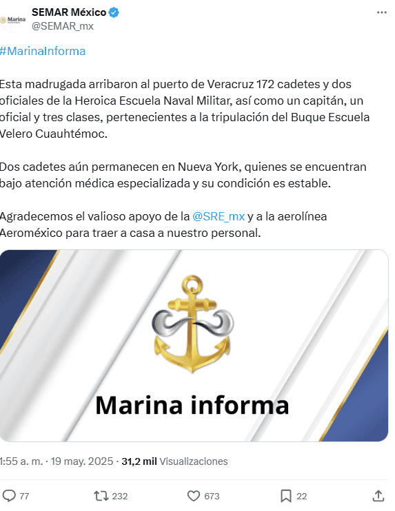 A través de un comunicado emitido en sus redes sociales, la Secretaría de Marina (Semar) informó que la tripulación del Buque Escuela Velero Cuauhtémoc, a excepción de las dos personas que resultaron heridas y son atendidas en Nueva York, regresaron a México.De acuerdo con lo informado, en la madrugada de este lunes arribaron a Veracruz 172 cadetes y dos oficiales de la Heroica Escuela Naval Militar, así como un capitán, un oficial y tres clases que integraban la tripulación que se estrelló contra el Puente de Brooklyn en Nueva York la noche del sábado.En el incidente murieron la cadete América Yamilet Sánchez, de Veracruz, y el marino Adal Jair Maldonado Marcos, de Oaxaca. Se espera que los cuerpos sean trasladados este lunes a México.El Cuauhtémoc chocó la tarde del sábado contra el icónico puente de 142 años, que no sufrió daños mayores en su estructura. Hasta el momento se desconocen las causas de la colisión y es probable que la investigación de la Junta Nacional de Seguridad en el Transporte (NTSB, por sus iniciales en inglés) tome varios meses.En varios videos de testigos quedó registrado el momento en el que tres mástiles del buque chocaron contra puente y se partieron uno por uno mientras la embarcación seguía avanzando rápidamente en reversa en el río East.La embarcación había llegado el 13 de mayo a Nueva York como parte de una gira mundial de buena voluntad por 15 naciones y atracó en el turístico South Street Seaport para recibir visitantes durante varios días. El Cuauhtémoc, que navegó por primera vez en 1982, mide unos 94 metros de largo y su mástil principal tiene una altura de 50 metros.* * * Mantente al día con las noticias, únete a nuestro canal de WhatsApp * * *MB