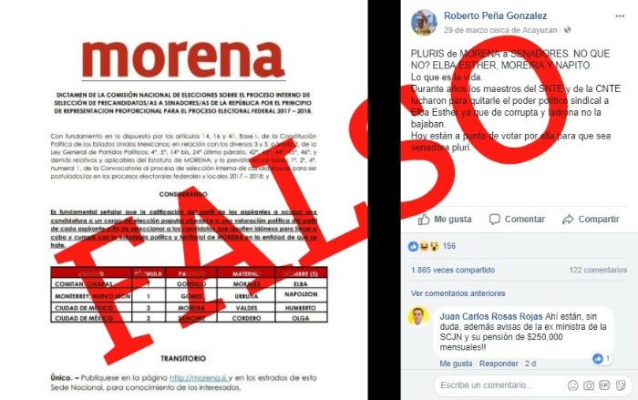Es falsa la imagen que circula en redes sociales en la que se muestra un supuesto dictamen de Morena que establece a la líder vitalicia del Sindicato Nacional de Trabajadores de la Educación (SNTE), Elba Esther Gordillo, como candidata al Senado por Morena. Dicha imagen ha sido compartida más de mil 800 veces en redes sociales.