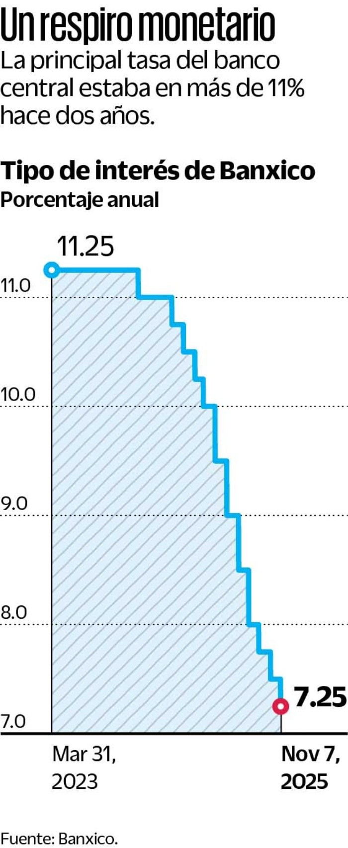 Pero en lo que va del 2025 ya son siete ocasiones que ha disminuido el objetivo para la Tasa de Interés Interbancaria; tres de 25 puntos base y cuatro de medio punto.