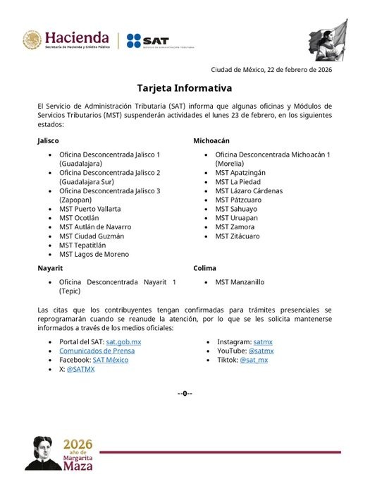 El Servicio de Administración Tributaria (SAT) informó que, como parte de las acciones preventivas derivadas de la situación de seguridad registrada en distintas entidades del país, algunas oficinas y Módulos de Servicios Tributarios (MST) suspenderán actividades este lunes 23 de febrero en los estados de Jalisco, Michoacán, Nayarit y Colima.En Jalisco, permanecerán cerradas las Oficinas Desconcentradas Jalisco 1 (Guadalajara), Jalisco 2 (Guadalajara Sur) y Jalisco 3 (Zapopan), así como los MST de Puerto Vallarta, Ocotlán, Autlán de Navarro, Ciudad Guzmán, Tepatitlán y Lagos de Moreno. En el caso de Michoacán, la suspensión aplicará para la Oficina Desconcentrada Michoacán 1 (Morelia) y los Módulos de Apatzingán, La Piedad, Lázaro Cárdenas, Pátzcuaro, Sahuayo, Uruapan, Zamora y Zitácuaro.Asimismo, el MST de Manzanillo, en Colima, y la Oficina Desconcentrada Nayarit 1, ubicada en Tepic, también interrumpirán sus servicios durante la jornada del lunes. El SAT señaló que las citas confirmadas para trámites presenciales serán reprogramadas en cuanto se reanude la atención, y pidió a los contribuyentes mantenerse informados únicamente a través de los canales oficiales para conocer nuevas fechas y actualizaciones. Los medios oficiales disponibles son el portal sat.gob.mx, así como las cuentas institucionales del organismo en Instagram (@satmx), YouTube (@satmx), Facebook (SAT Méx) y los comunicados de prensa publicados por la institución.La autoridad fiscal agradeció la comprensión de los usuarios y reiteró que la medida tiene como objetivo prioritario salvaguardar la integridad del personal y de los contribuyentes, asegurando que las actividades se retomarán en cuanto existan condiciones de seguridad adecuadas. EE