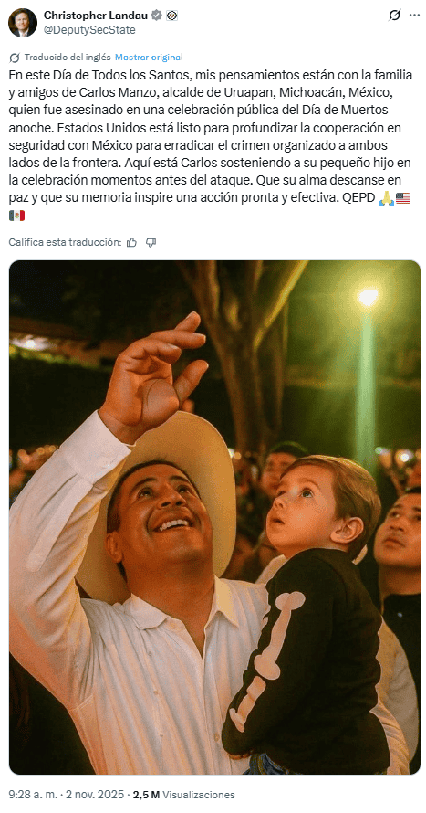 El subsecretario de Estado de Estados Unidos, Christopher Landau, lamentó el asesinato del presidente municipal Carlos Manzo, y expresó la disposición del gobierno estadounidense para profundizar la cooperación en materia de seguridad con México, a fin de combatir al crimen organizado en ambos lados de la frontera.