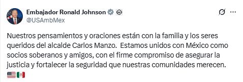 Mientras tanto, el embajador de Estados Unidos en México, Ronald Johnson, expresó sus condolencias a la familia y seres queridos del alcalde Carlos Manzo.