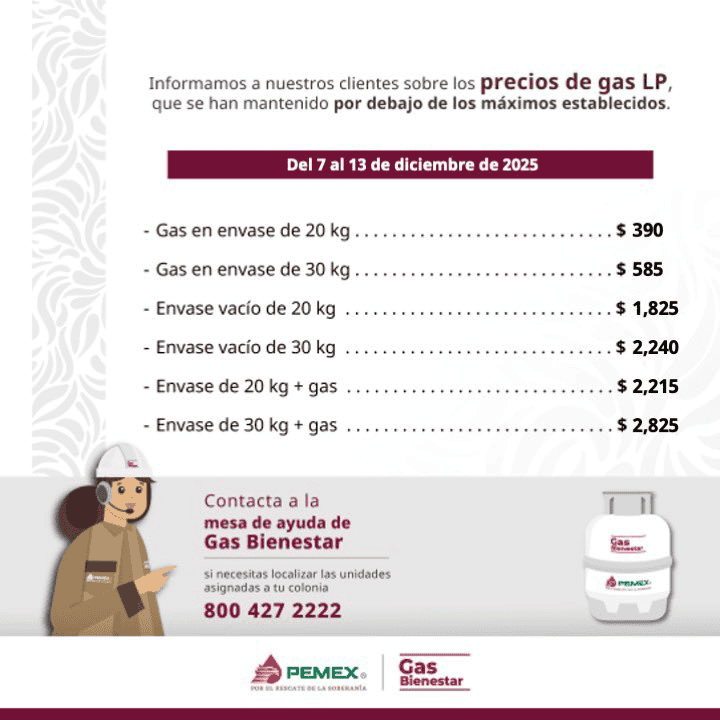 Como parte de sus actividades regulares, Gas Bienestar anunció las tarifas que estarán vigentes del 8 al 13 de diciembre de 2025. Los precios se mantienen en un rango competitivo con respecto a las empresas privadas, con el objetivo de asegurar que los hogares de la capital y su zona metropolitana cuenten con un servicio confiable y asequible.