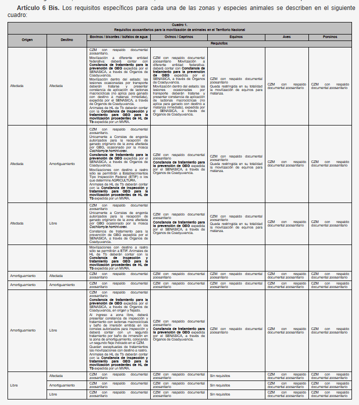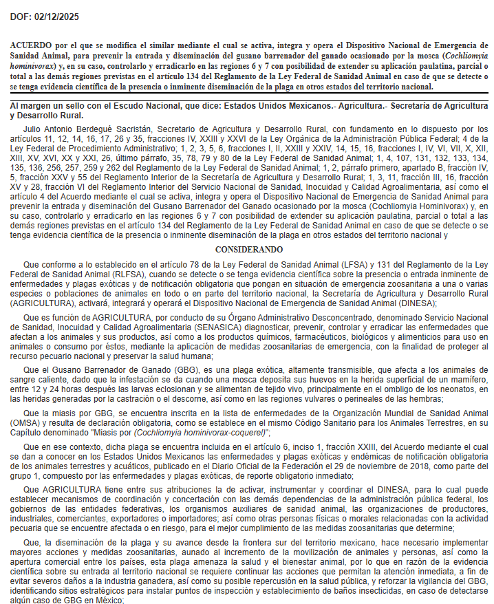 Con la publicación del acuerdo que refuerza el Dispositivo Nacional de Emergencia de Sanidad Animal (Dinesa) para contener el gusano barrenador del ganado (GBG) en México, hoy se pusieron en marcha nuevas acciones de control y erradicación de dicha plaga en el país. En un comunicado, la Secretaría de Agricultura y Desarrollo Rural (Sader) informó que hoy se publicó en el Diario Oficial de la Federación (DOF) el acuerdo que amplía las medidas para prevenir, controlar y erradicar la miasis causada por el GBG, con el apoyo y colaboración de todos los sectores relacionados con la producción pecuaria y, de igual manera, de la población en general. La dependencia explicó que dicho instrumento es de observancia obligatoria para las secretarías de Desarrollo Agropecuario de los Estados, las y los propietarios, responsables o poseedores de animales susceptibles a la plaga; las y los médicos veterinarios oficiales y de libre ejercicio, las y los importadores de ganado, organismos de certificación, laboratorios de pruebas, organismos auxiliares de sanidad animal, personas que ingresan y transitan en el país en compañía de animales susceptibles, así como vehículos contenedores de mercancías que provengan o que hayan transitado por países o regiones con brotes del GBG. Todos estos sujetos están obligados a notificar cualquier tipo de gusaneras al personal del Servicio Nacional de Sanidad, Inocuidad y Calidad Agroalimentaria (Senasica), organismo clave en la estrategia de prevención, control y erradicación del gusano barrenador del ganado a nivel nacional. A partir de hoy, los movilizadores de ganado bovino, bufalino, bisontes, ovino, caprino, porcino y aves deben cumplir con lo establecido en las disposiciones legales aplicables y presentar el Certificado Zoosanitario de Movilización (CZM) para cualquier traslado de animales. Los animales deben ser tratados con antiparasitarios de tres a cinco días antes de gestionar el CZM. Posterior al tratamiento y previo a la movilización, el ganado debe ser bañado por aspersión o inmersión con un producto insecticida de efecto larvicida y será sujeto a inspección física, con el fin de descartar la presencia de heridas y gusaneras. De ninguna manera deben movilizarse animales incapaces de mantenerse en pie, enfermos, fatigados, con heridas o con gusaneras, a fin de mitigar el riesgo de dispersión de la mosca del GBG. Los animales con heridas deben ser tratados por sus propietarias y propietarios, con el apoyo de insecticidas de acción larvicida y cicatrizante, y permanecer en la unidad de producción pecuaria o centro de acopio de origen hasta que las heridas estén completamente cicatrizadas. Para todas las movilizaciones con origen en zona afectada se deberán asentar en el CZM los Puntos de Verificación e Inspección Federal (PVIF), Puntos de Verificación e Inspección Interna (PVI) y Puntos de Verificación e Inspección Emergentes (PVIEM) por los que transitará el cargamento para su inspección o tratamiento. Para mayor información, consulta aquí https://dof.gob.mx/nota_detalle.php?codigo=5774853&fecha=02/12/2025&print=trueEE
