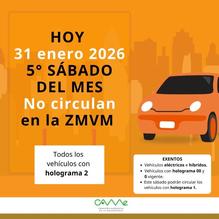 La calidad del aire ha mejorado en la Ciudad de México y esta mañana de sábado se cataloga como "aceptable", con la presencia de partículas PM₂.₅ y un riesgo moderado para personas vulnerables.Los niveles de contaminación resultan manejables y no resulta necesario activar la fase 1 de contingencia ambiental.El programa de control de emisiones vehiculares Hoy No Circula se implementa de manera habitual, en su modalidad de quinto sábado de mes, con prohibición de salir a la calle para los vehículos con las siguientes características:Están exentos de la restricción los autos con holograma 1, vehículos de emergencia, el transporte público, los autos eléctricos o híbridos con holograma 0 o doble 0, las motocicletas y los automóviles con placas para personas con discapacidad.El programa Hoy No Circula se aplica de las 5:00 a las 22:00 horas en todas las alcaldías de la Ciudad de México y en 18 municipios conurbados: Atizapán de Zaragoza, Coacalco de Berriozábal, Cuautitlán, Cuautitlán Izcalli, Chalco, Chicoloapan, Chimalhuacán, Ecatepec de Morelos, Huixquilucan, Ixtapaluca, La Paz, Naucalpan de Juárez, Nezahualcóyotl, Nicolás Romero, Tecámac, Tlalnepantla de Baz, Tultitlán y Valle de Chalco, en el Estado de México.Asimismo, el programa se aplica en las áreas metropolitanas de Toluca y Santiago Tianguistenco.Ignorar la norma puede sancionarse con multas de 20 a 30 Unidades de Medida de Actualización (UMA), equivalentes a entre 2 mil 346 y 3 mil 519 pesos.La Dirección de Monitoreo Atmosférico de la Ciudad de México informó en su reporte de las 6:00 horas que la calidad del aire en la capital del país era "aceptable" , con un nivel de riesgo moderado, debido a la presencia de contaminantes PM₂.₅.Las estaciones Tlalnepantla, Merced y UAM Iztapalapa mostraban color amarillo (calidad aceptable), el resto, verde (calidad buena).La Dirección de Monitoreo Atmosférico actualiza cada hora la calidad del aire en el Valle de México, con el objetivo de alertar a la población y permitir la toma de decisiones oportunas cuando la contaminación representa un riesgo para la salud.