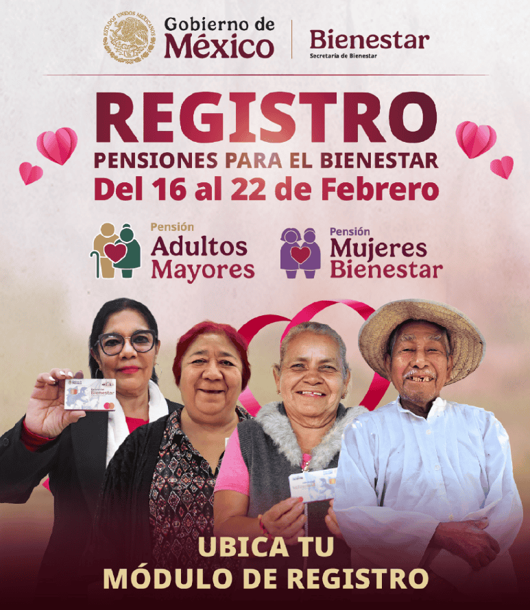 La titular de la Secretaría de Bienestar, Ariadna Montiel, informó el pasado lunes 9 de febrero que el periodo de registro para recibir la Pensión Mujeres Bienestar se abrirá del 16 al 22 de febrero de 2026. La Pensión Mujeres Bienestar es uno de los Programas para el Bienestar, impulsados por el Gobierno de México. Tiene el objetivo de contribuir a mejorar el nivel de autonomía económica de todas las mujeres mexicanas de 60 a 64 años, reconociendo toda una vida de trabajo de las mujeres. Para este año, el programa ofrecerá un apoyo económico de tres mil 100 pesos entregados de manera bimestral a todas las beneficiarias, a través de la tarjeta del Banco del Bienestar, de manera directa y sin intermediarios. En esta ocasión el registro se realizará de manera presencial, en los módulos físicos establecidos en las entidades federales. Se instalaron más de dos mil 500 módulos para realizar el registro este año en todo el territorio mexicano. Para ubicar tu módulo, ingresa al portal digital www.ubicatumodulo.bienestar.gob.mx y coloca el nombre de tu entidad y municipio. Rellena la casilla del captcha y da clic en buscar. Da clic a la imagen para redirigirte a la página oficial y ubicar el módulo de tu preferencia: Cada módulo tendrá un horario de atención de lunes a domingo de las 10:00 a las 16:00 horas. En caso de no poder realizar el registro presencial, se puede solicitar una visita domiciliaria. Los documentos que deberás presentar para realizar el registro sin retrasos o eventualidades son: Las personas que quieran sumarse al programa y recibir el apoyo económico, únicamente deben cumplir con los siguientes requisitos: Este lunes 16 de febrero de 2026 deben realizar su registro, las personas cuyo apellido paterno comience con la letra A, B y C. Con información de SUN.EE