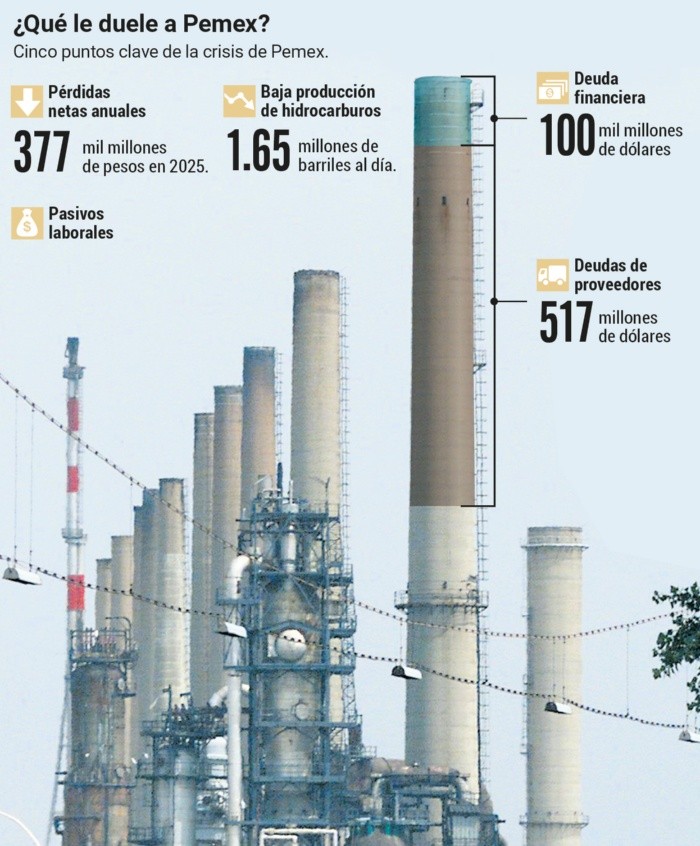 Petróleos Mexicanos (Pemex) se sigue ahogando por las deudas, el gasto en pensiones y las pérdidas, agravándose además con la baja producción de hidrocarburos y las deudas que colocan a la paraestatal en números rojos.Los reportes financieros de Pemex correspondientes al año 2025 indican que la paraestatal perdió más de 377 mil millones de pesos (MDP) durante todo el año.En agosto, la presidenta Claudia Sheinbaum presentó el plan para que la empresa del Estado deje de requerir apoyo financiero de la Secretaría de Hacienda y Crédito Público, que consiste en optimizar la carga fiscal de Pemex y mejorar su flujo de efectivo; reducción de deuda de corto plazo, priorizando el pago de obligaciones a proveedores durante 2025 y 2026; y estabilización financiera y recuperación del grado de inversión con un fondo de inversión para reducir su deuda.“Para 2027, gracias a todo el trabajo de Hacienda, Pemex sale solito, no va a requerir del apoyo”, dijo la mandataria en aquella ocasión.Las medidas financieras han sido bien recibidas por inversionistas y agencias calificadoras, que mejoraron la nota crediticia de Pemex, ya que los bonos de la petrolera también se han apreciado en las últimas semanas, mientras que se han colocado bonos por la Bolsa Mexicana de Valores para conseguir financiamiento.Aun con eso, para Emiliano Tello, investigador de Desarrollo Económico del IMCO, el problema principal de Pemex es el modelo financiero de la paraestatal, al considerar que no se ha corregido el deterioro de sus operaciones ni los pasivos.“Es un problema de su modelo financiero. Los apoyos han solventado, pero no se ha corregido ni el deterioro operativo ni la acumulación de pasivos para la empresa”.Pero el monto de la deuda ascendió a 100 mil millones de dólares (MDD), lo que equivale a más de 1.8 billones de pesos, mientras que la deuda con proveedores y contratistas asciende a 517 mil MDD, todo esto durante los últimos meses. Y casi la mitad de la deuda vencerá entre 2026 y 2027, lo que presiona las finanzas de Pemex.Por otro lado, otra meta incumplida es la producción de crudo y condensados, la cual cayó 7% de forma interanual, al situarse en 1.65 millones de barriles diarios, lejos de la meta establecida de 1.8 millones de barriles por día; de la misma forma, la producción de gas natural bajó a poco más de 3 mil millones de pies cúbicos por día, aunque el procesamiento de crudo registró un leve incremento.En este contexto, Grupo Carso, del magnate mexicano Carlos Slim, ha invertido hasta 2 mil MDD en la paraestatal en los últimos meses. Sin embargo, para Antonio Sánchez Sierra, académico de la Universidad de Guadalajara, será difícil salvar a la petrolera nacional aun con los recursos invertidos.“No tiene la capacidad ya de reinventarse, de volver a meterle activos. El boquete sigue creciendo (…) se tiene que hacer una reestructuración total para el efecto de hacerla más eficiente”.A la deuda y a la baja rentabilidad se suma el robo de combustibles que, durante el primer semestre de 2025, le representó pérdidas por más de 13 mil millones de pesos a Pemex debido al huachicol, una actividad ilícita que no ha logrado erradicarse y que sigue creciendo, mientras que las pensiones representaron 57 mil MDP en los primeros nueve meses del año.Una de las metas que siguen sin ser cumplidas por parte del Gobierno Federal en el sector de los hidrocarburos es la producción de crudo y condensados.Durante los primeros nueve meses de 2025, la producción de petróleo cayó 7% de forma interanual, al situarse en 1.65 millones de barriles diarios, lejos de la meta establecida de 1.8 millones de barriles por día, según datos de Petróleos Mexicanos (Pemex).De acuerdo con la presidenta de México, Claudia Sheinbaum, se ha realizado una importante inversión en ocho refinerías del país que le permiten a Pemex recuperar su capacidad de refinación y de producción de más de un millón de barriles diarios para alcanzar la soberanía energética nacional.La refinería Olmeca, ubicada en Dos Bocas, en el estado de Tabasco, reportó en noviembre un procesamiento de crudo menor al expresado por la Secretaría de Energía (Sener), de acuerdo con las cifras oficiales dadas a conocer por Petróleos Mexicanos (Pemex), con un total de 207 mil barriles diarios de crudo.Las cifras también se mantienen lejos de las metas iniciales planteadas por el gobierno anterior al anunciar la construcción de esa refinería, cuyas obras costaron cerca de 21 mil millones de dólares y que apuntaban a un nivel de procesamiento de 340 mil barriles diarios de crudo.De la misma forma, la producción de gas natural bajó a poco más de 3 mil millones de pies cúbicos por día, aunque el procesamiento de crudo registró un leve incremento, insuficiente para compensar la caída general en la plataforma de producción nacional. Para Mario Di Costanzo, economista y analista financiero, las reformas energéticas impulsadas durante el gobierno de Andrés Manuel López Obrador y continuadas por Claudia Sheinbaum no lograron fortalecer a Petróleos Mexicanos (Pemex). Por el contrario, consideró que los cambios legales, fiscales y organizacionales profundizaron problemas estructurales que hoy mantienen a la empresa productiva del Estado en una situación financiera y operativa crítica.De acuerdo con el especialista, Pemex enfrenta una menor producción de hidrocarburos, pérdidas constantes en el negocio de refinación y un endeudamiento que, aunque similar al heredado de administraciones anteriores, se agrava por los pasivos acumulados con proveedores y por decisiones de política energética que no priorizaron la rentabilidad ni la modernización de la empresa.Di Costanzo explicó que uno de los principales ajustes fue la reducción gradual de la carga fiscal, que actualmente ronda el 35 por ciento, una disminución respecto a niveles previos. Sin embargo, subrayó que esta medida no resolvi