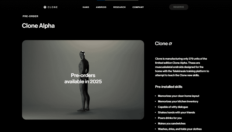 Este 19 de febrero, la empresa estadounidense de robótica “Clone robotics” presentó en sus oficinas de California los avances de su androide que promete ser el más avanzado del mundo. Con el nombre de “PROTOCLONE” Clone robotics presentó los movimientos básicos del androide que estaba suspendido en el aire para poder observar de mejor manera sus movimientos.Este androide, según información de la misma empresa, tiene más de 1000 músculos artificiales y 500 sensores para emular de mejor manera el comportamiento físico humano. Te podría interesar: Asteroide 2024 YR4: La probabilidad de impacto disminuye a la mitadEn su sitio web oficial, Clone robotics ofrece los detalles de sus modelos de androides, sus ventajas respecto a los humanos y las tareas que pudieran realizar; incluso, la página ofrece el servicio de preventa para poder adquirir el modelo “Clone Alpha” del cual solo se harán 279 ejemplares, según las mismas especificaciones de la empresa. Algunas de las habilidades que vendrían pre-guardadas en el androide serían:El video fue compartido en redes sociales y causó conmoción entre los espectadores por los movimientos y el realismo presentado por el androide. Sin embargo, habrá que esperar al desarrollo del prototipo o si solamente sería un timo como ha existido en distintas ocasiones.
