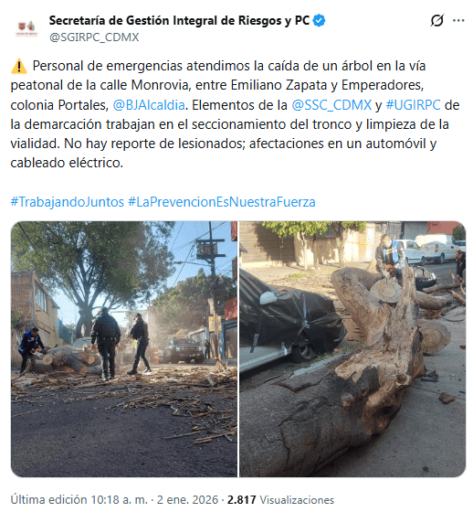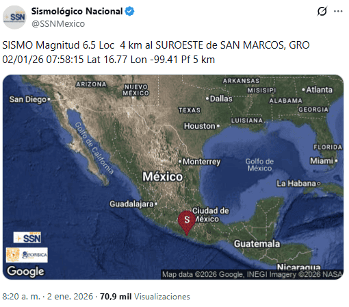 México | Temblor HOY EN VIVO: Actualizaciones tras el sismo en Guerrero Conoce lo más relevante y reciente sobre el sismo que se registró este viernes 2 de enero en Guerrero Oralia López 2 de enero de 2026 - 21:49 hs Tras revisión, sin afectaciones al patrimonio cultural por sismo 2026-01-02 21:49A través de sus redes sociales, la Secretaría de Cultura federal y su representante, Claudia Curiel de Icaza, informaron que no se registraron daños en el patrimonio cultural en las zonas afectadas por el sismo de este 2 de enero, cuyo epicentro se ubicó en Guerrero. Mientras que el área de comunicación del INAH no reportó daños en Guerrero, Oaxaca y Ciudad de México. CFE normaliza suministro eléctrico tras sismo de 6.5 2026-01-02 21:48La Comisión Federal de Electricidad (CFE) informó que el movimiento telúrico provocó afectaciones al suministro eléctrico de 688 mil 546 usuarios en distintas regiones del país. De acuerdo con el reporte más reciente, solo 112 usuarios permanecen sin suministro eléctrico, por lo que los trabajos de reparación y reconexión se mantienen activos, principalmente en zonas del estado de Guerrero. Sismo con epicentro en Guerrero deja dos personas fallecidas 2026-01-02 05:45De acuerdo con información preliminar, el sismo dejó un saldo de dos personas fallecidas, cuyos decesos ocurrieron en circunstancias distintas, pero relacionadas directamente con el fenómeno sísmico En Guerrero, una mujer de aproximadamente 50 años perdió la vida en la comunidad de Las Minas, municipio de San Marcos, luego de que su vivienda colapsara a consecuencia del sismo. En la Ciudad de México, un hombre de 60 años falleció en la alcaldía Benito Juárez mientras evacuaba el edificio donde se encontraba. Más de 400 réplicas 2026-01-02 12:33Hasta las 12:00 del mediodía, se han registrado un total de 420 réplicas del sismo; de acuerdo con los reportes de monitoreo sísmico, la réplica de mayor intensidad alcanzó una magnitud de 4.2. Fallece un hombre tras evacuar su vivienda en la CDMX 2026-01-02 12:05De acuerdo con información de El Universal, la alcaldía Benito Juárez, en la CDMX, confirmó el fallecimiento de un hombre de 60 años de edad en la colonia Álamos. En una tarjeta informativa se detalló que, durante el sismo, la víctima desalojó su departamento ubicado en un segundo piso, tropezó y perdió el conocimiento. Personal de seguridad del inmueble solicitó apoyo de los servicios de emergencia. Al lugar acudió la unidad 695 del Centro Regulador de Urgencias Médicas (CRUM), cuyos paramédicos confirmaron que el hombre ya no presentaba signos vitales. Reportan afectaciones en aeropuertos 2026-01-02 12:00La Agencia Federal de Aviación Civil (AFAC) informó que, tras el sismo, se activaron protocolos de revisión en aeropuertos. El AICM Terminal 2 y el Aeropuerto Internacional de Acapulco presentan daños menores en acabados, como vidrios rotos y caída de plafones, sin afectar las operaciones ni a los usuarios o trabajadores. La AFAC mantiene coordinación con autoridades para verificar las condiciones de seguridad y dar seguimiento a la situación. Reporte del sismo en la CDMX 2026-01-02 11:19La jefa de Gobierno de la CDMX, Clara Brugada, informa que después de activar el protocolo de actuación por el sismo, se tiene el reporte al momento de 12 personas lesionadas en la capital del país; la caída de 5 postes y 4 árboles; así como 18 denuncias por falta de suministro eléctrico en distintas colonias. Se evalúan 2 estructuras por riesgo de colapso, y de manera preventiva se inspeccionan 34 edificios y 5 casas habitación. X / @SGIRPC_CDMX Réplicas del sismo 2026-01-02 11:15De acuerdo con información del Servicio Sismológico Nacional (SSN), hasta hasta el corte de las 10:00, se han registrado 151 réplicas del sismo de magnitud 6.5, con epicentro en San Marcos, la más fuerte de magnitud 4.4. Derrumbes en la Autopista del Sol 2026-01-02 09:00La Secretaría de Gestión Integral de Riesgos y Protección Civil Guerrero reportó derrumbes en la Autopista del Sol. Pidió extremar medidas de cuidado si se maneja por la vías, así como otros tramos carreteros de las regiones Costa Chica y Costa Grande, debido a la presencia de derrumbes y deslaves sobre la cinta asfáltica, los cuales ya son atendidos por las autoridades correspondientes. Km 343: deslave con dirección a Cuernavaca Km 335: otro deslave rumbo a Acapulco Km 327: retención por deslave Km 319: múltiples piedras sobre la carpeta asfáltica Continuan las afectaciones por los deslaves a lo largo de la autopista del sol y en carreteras tanto en Costa Chica como en Costa Grande. pic.twitter.com/KgZaZFicvd — Daniel Osorio (@danoga) January 2, 2026 Primeros reportes en Guerrero 2026-01-02 08:45La Secretaría de Gestión Integral de Riesgos y Protección Civil del Estado de Guerrero, dio a conocer los primeros reportes tras el sismo. Informó que realizan recorridos y se atienden los reportes recibidos en la línea única de emergencias 911 en los 85 municipios del estado de Guerrero. Preliminar de afectaciones hasta el momento: Acapulco Se han atendido reportes de fugas de gas LP en Acapulco. Derrumbes de tierra y rocas en la Av. Escénica, Sinfonía del Mar y Calzada a Pie de la Cuesta. Daños en cristales, plafones y acabados en inmuebles de Acapulco. San Marcos Se reportaron derrumbes menores en la carretera federal Acapulco- Pinotepa Nacional, entre Acapulco y San Marcos, cerca del poblado de la Caridad. Juan R. Escudero Se reportó un derrumbe de tierra y rocas en la carretera Tierra Colorada- Carrizal. Tixtla de Guerrero Se reportó el derrumbe de una barda de adobe en la calle Aldama. Primeros reportes del sismo 2026-01-02 08:40Al volver a la transmisión después de la evacuación, Sheinbaum informó sobre el sismo: "Hablé con la gobernadora Evelyn Salgado, ellos están citando al consejo de protección civil, hasta ahora parece que no hay daños graves, pero vamos a espera