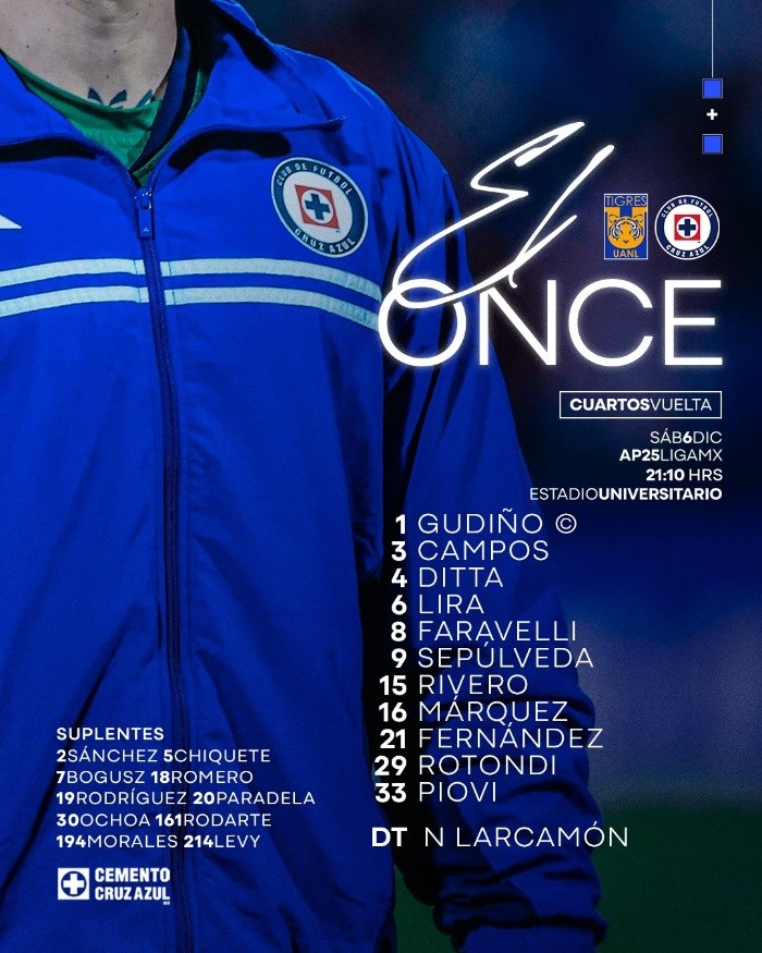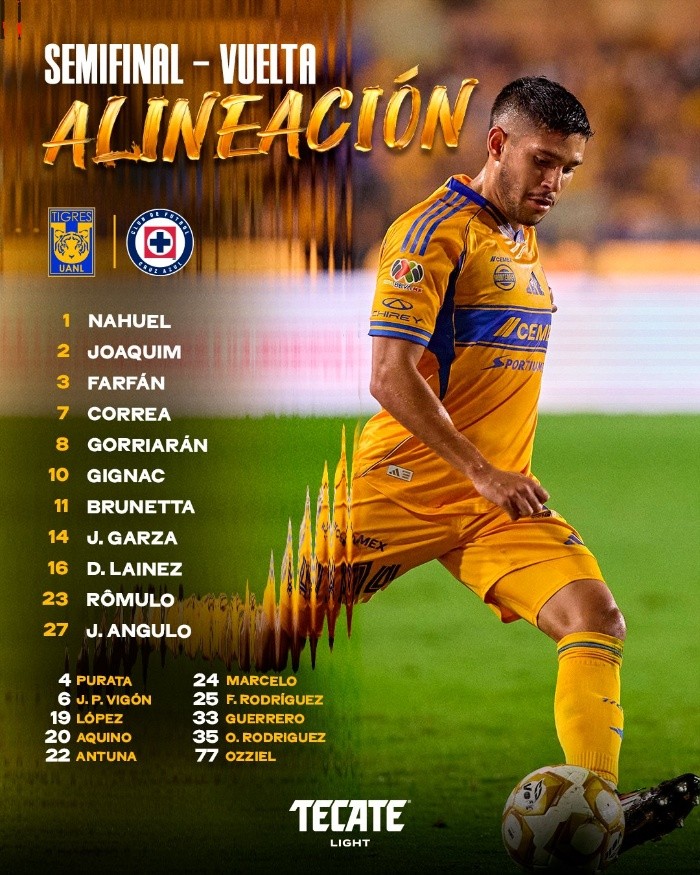 Deportes | Tigres vs Cruz Azul • Momentos Destacados • Semifinal Vuelta • Apertura 2025 Ambos equipos se enfrentan este sábado en un duelo decisivo que definirá al finalista del Apertura 2025 en la Liga MX Sergio Alejandro Velázquez 6 de diciembre de 2025 - 19:30 hs TIGRES1 ‒ 0CRUZ AZUL 27' ¡Tigres abre el marcador! ¡Gol de Tigres! Juan Brunetta culmina la jugada con un remate raso de derecha desde el centro del área, ajustado al poste izquierdo. La acción nació de una habilitación de André-Pierre Gignac, quien filtró el balón con precisión para dejarlo de frente al arco. 20' Ambos equipos continúan intentando Tigres vuelve a tocar la puerta: Juan Brunetta llega de frente al arco y saca un zurdazo dentro del área que pasa muy cerca del poste izquierdo, tras una transición conducida por Ángel Correa. En la réplica celeste, Ignacio Rivero prueba desde más de 30 metros con un derechazo potente, pero el balón se abre y termina por el costado derecho. 12' La Máquina vuelve a intentar Ángel Sepúlveda conecta un cabezazo a ras de césped desde el corazón del área, pero Nahuel Guzmán controla sin sobresaltos. La jugada nació de un centro de Lorenzo Faravelli. 6' Tigres toma la presión ofensiva Tigres responde adueñándose de la posesión y avanzando líneas. Ángel Correa conecta un derechazo dentro del área por el sector izquierdo, pero la zaga rechaza su intento tras el servicio de cabeza de Juan Brunetta. Instantes después, Fernando Gorriarán prueba desde larga distancia luego de un tiro de esquina, pero su remate se eleva demasiado y se pierde desviado por la derecha. 3' Cruz Azul comienza atacando Omar Campos prueba con un zurdazo desde fuera del área, pero su remate sale centrado y termina controlado junto al poste derecho. Comienza el partido El árbitro da el silbatazo y comienza a disputarse el partido que decidirá el segundo finalista del Apertura 2025. Previa del partido Tigres y Cruz Azul (1-1) se enfrentan este sábado en un duelo decisivo que definirá al finalista del Apertura 2025 en la Liga MX. El vencedor avanzará a la disputa por el título, donde se encontrará con Toluca o Monterrey, según quién gane la otra semifinal. Los felinos llegan con la ventaja de cerrar en casa y de su posición en la tabla —fueron segundos—, por lo que cualquier empate en el marcador global los coloca en la final del torneo. Aunque Tigres parecía encaminarse al triunfo, un penal al 76’ revivió a Cruz Azul. Ángel Correa marcó su primer gol en esta Liguilla, mientras que Gabriel Fernández acortó distancias para los celestes desde los once pasos. Con este panorama, la Máquina está obligada a ganar, ya que solo la victoria los mantendría con vida rumbo a la final. El empate no les funciona, pues favorecería automáticamente a los universitarios. Horario: 21:10 horas Lugar: Estadio Universitario Transmisión: Canal 5, Azteca 7, TUDN, Fox, Fox One, Tubi y VIX SV Alineaciones Temas Tigres Máquina del Cruz Azul Liga MX Futbol Mexicano Apertura 2025 Lee También Toluca sufre, resiste y se instala en su segunda Final consecutiva Peso imparable; está entre las divisas con mejor desempeño Cine mexicano compite con los grandes estrenos de Hollywood Trump quiere cambiar el nombre del futbol americano